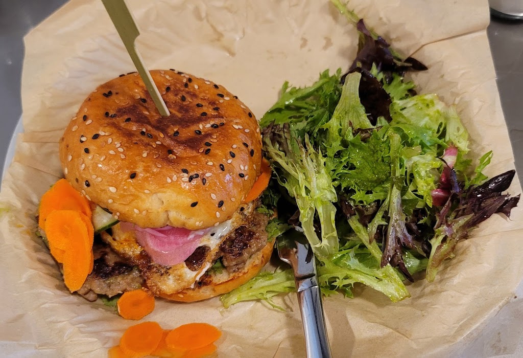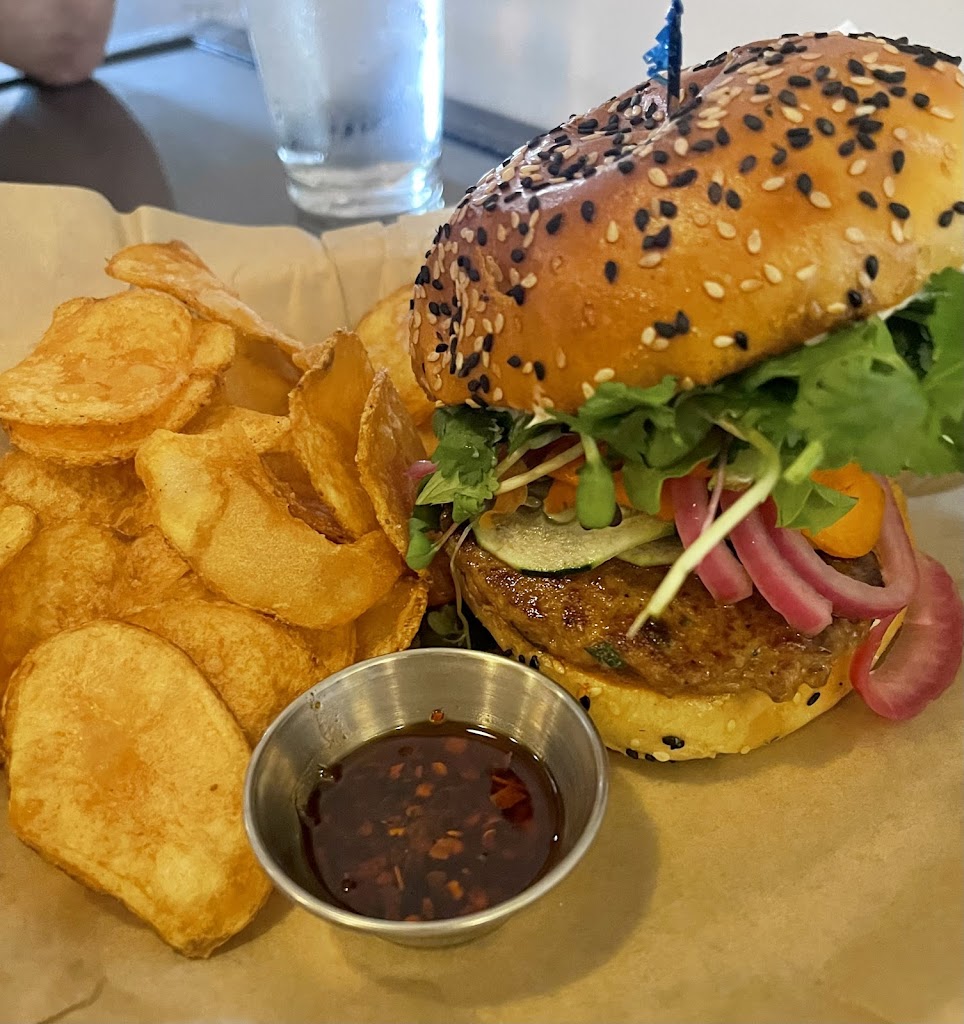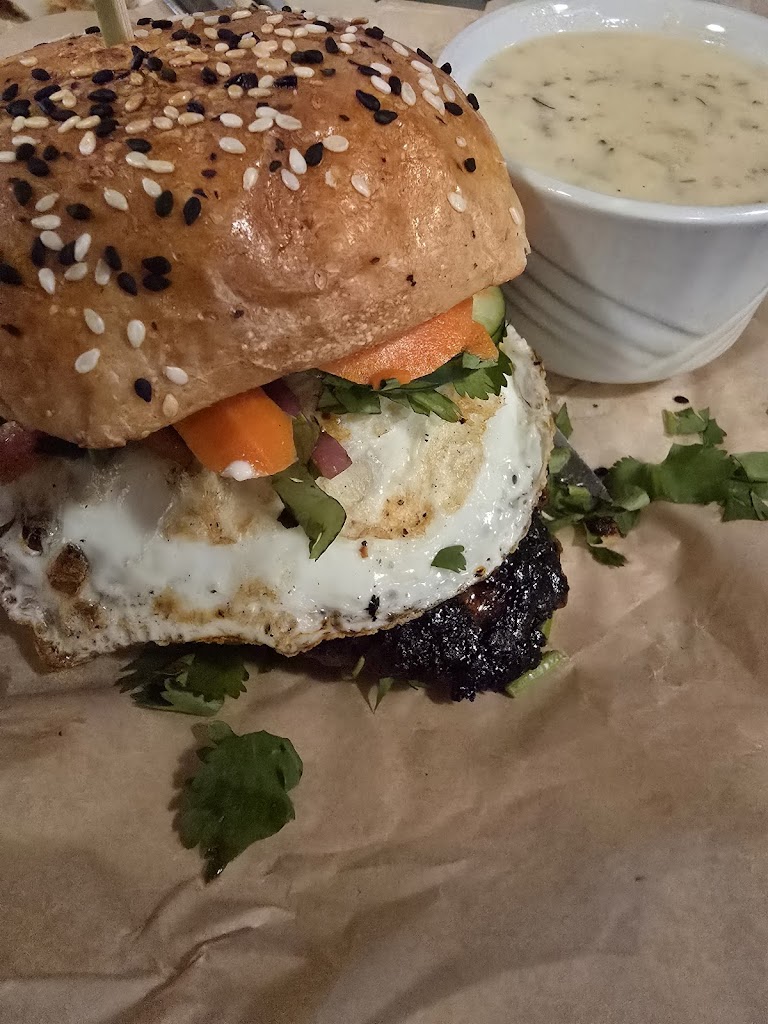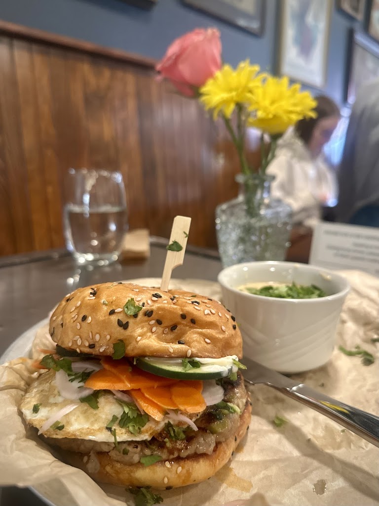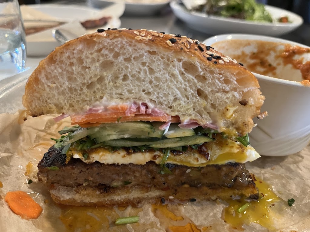 Bánh Mì Burger with a potsticker pork patty, pickled veggies, shaved cucumber, garlic mayo, chili crisp, cilantro, fried egg, seeded roll! Another one of their best sellers and I can see why.