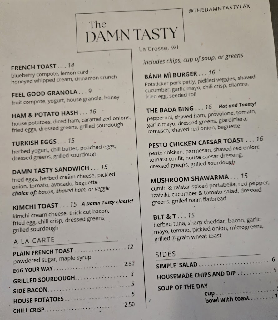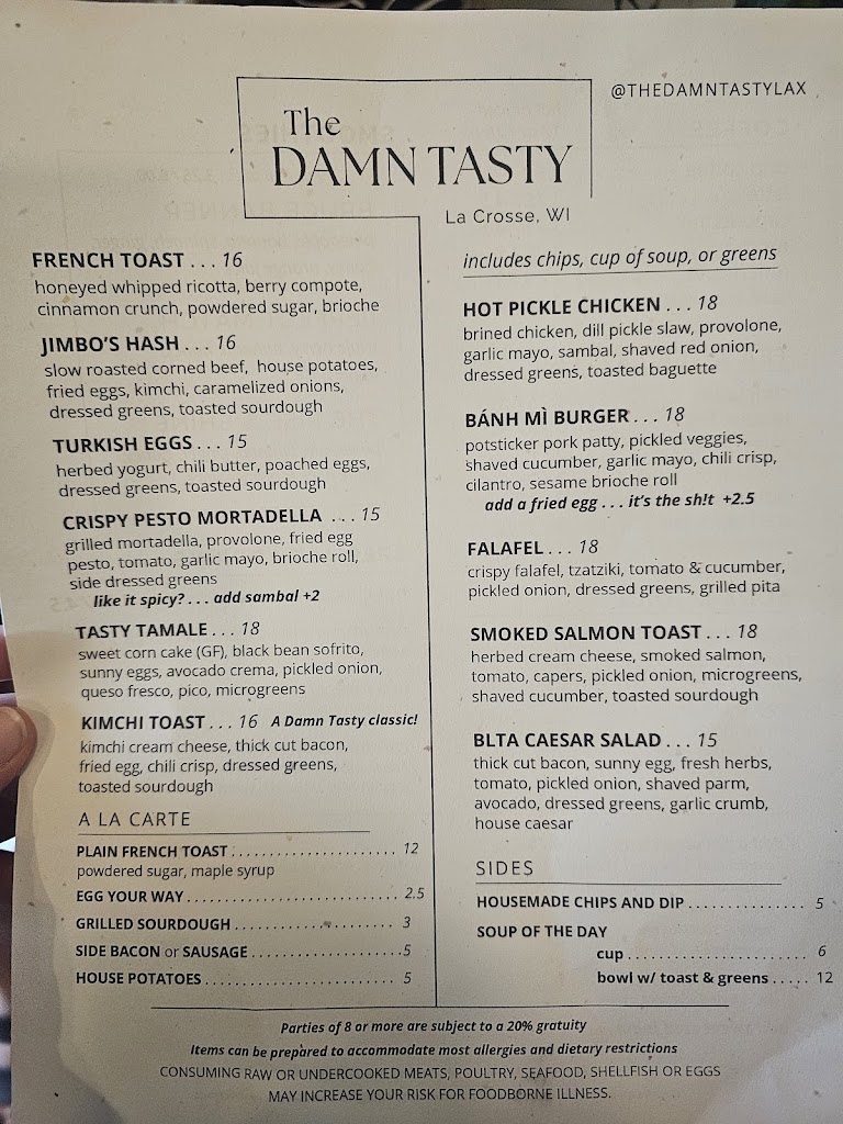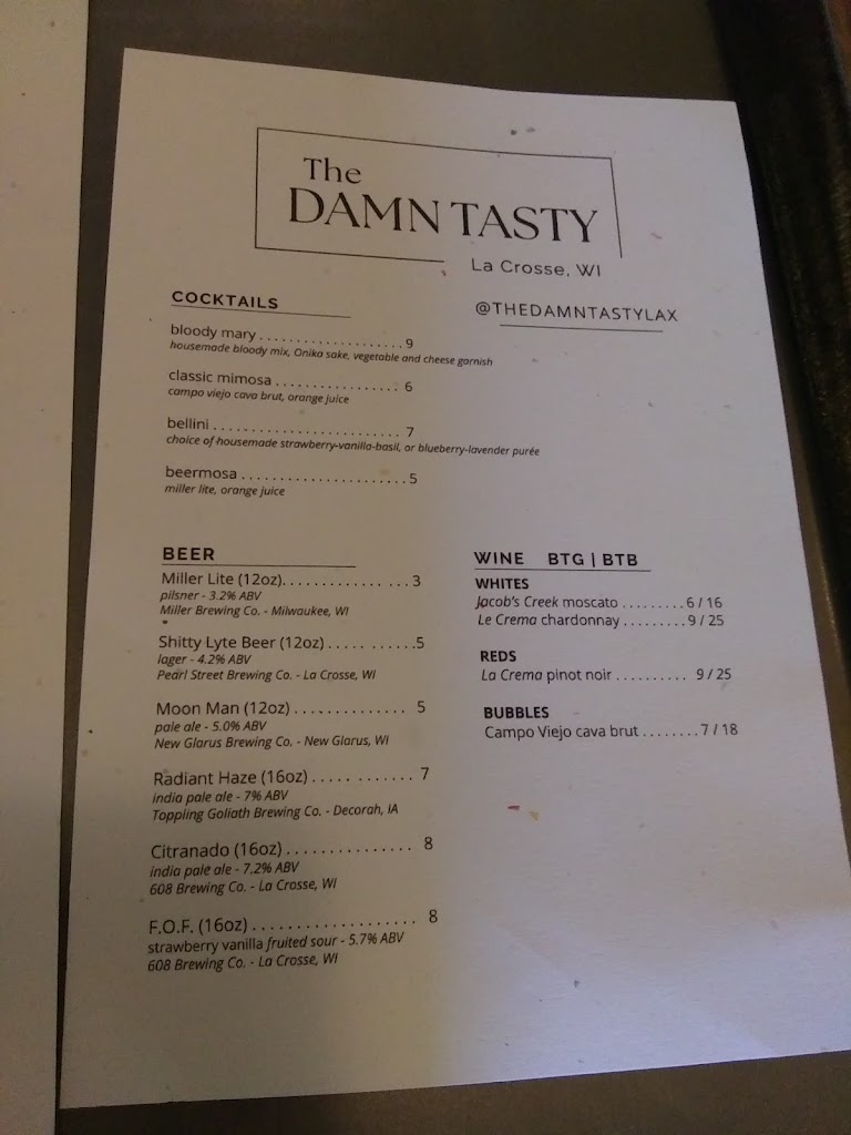 I’m back on the road again, looking for some of the best food and drinks throughout the midwest! The first stop was La Crosse, Wisconsin, where I was able to catch up with a good friend of mine. When we were talking about where to go for lunch, she said she had heard all about this restaurant, but hadn’t been. With the name like The Damn Tasty, we figured we better check it out and see if it lives up to its name. It was a little hard to find because they don’t have the most obvious sign directing you to their space in the strip of shops and we did have to put our name on the waiting list, but as you can see, it was WELL WORTH IT. The menu was fairly limited with some breakfast options and lunch options, but you could tell that the menu was curated and it was limited because they focused on doing everything well. Let’s get down to the food…