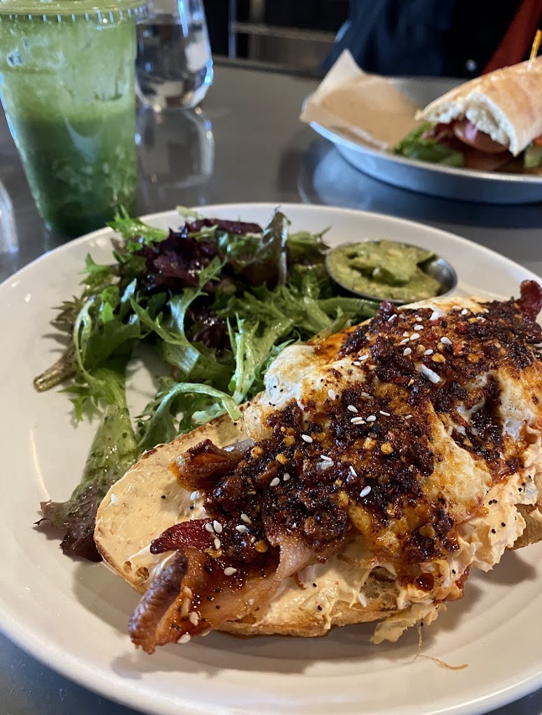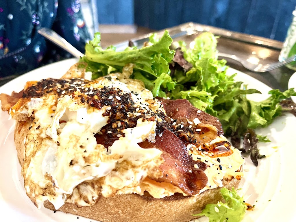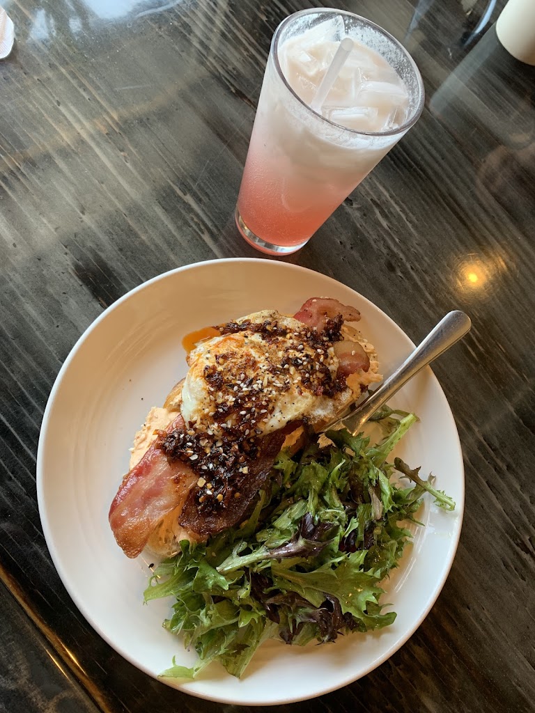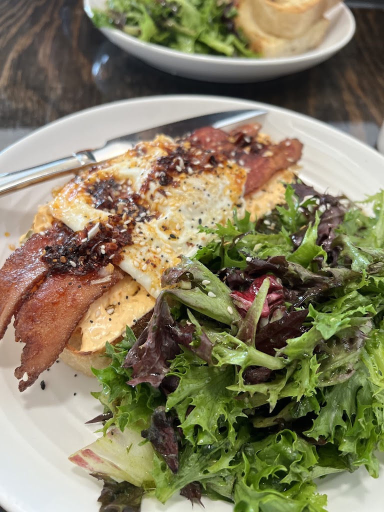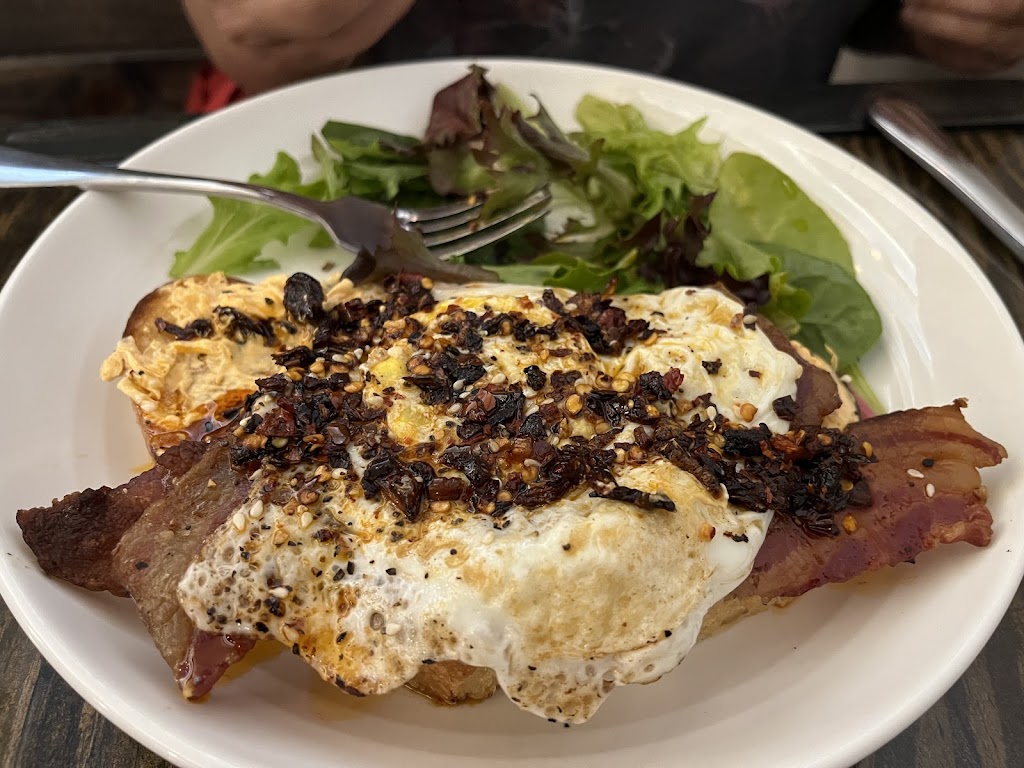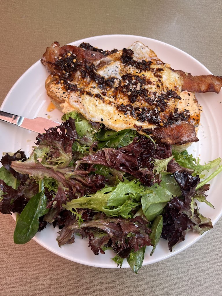 We ordered the Kimchi Toast with kimchi cream cheese, thick cut bacon, fried egg, chili crisp, dressed greens, grilled sourdough. Honestly, this was 10/10. A little messy to cut up, but holy cow the flavor…
