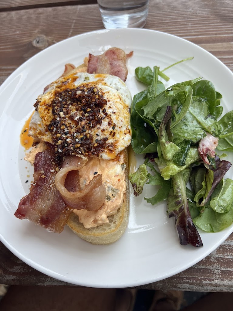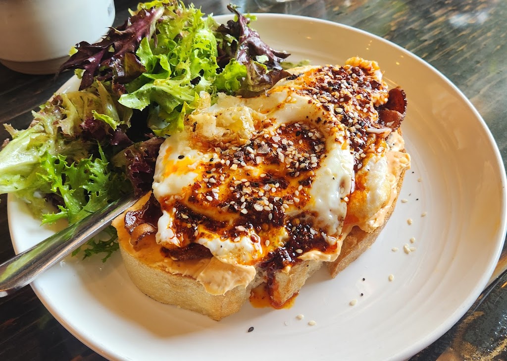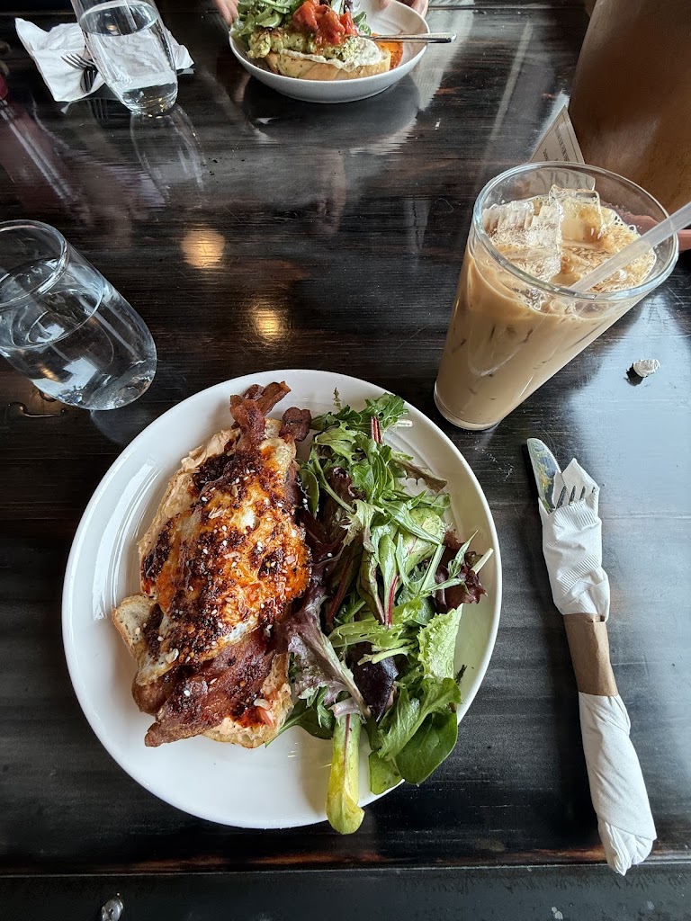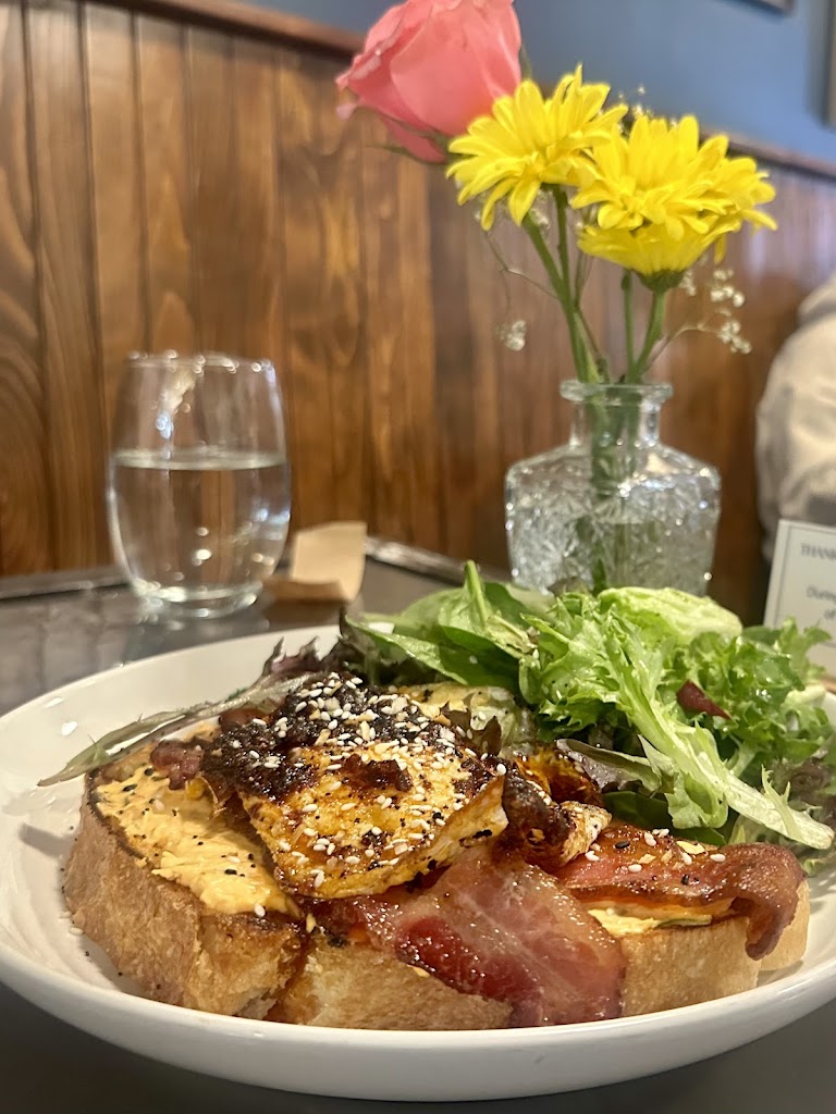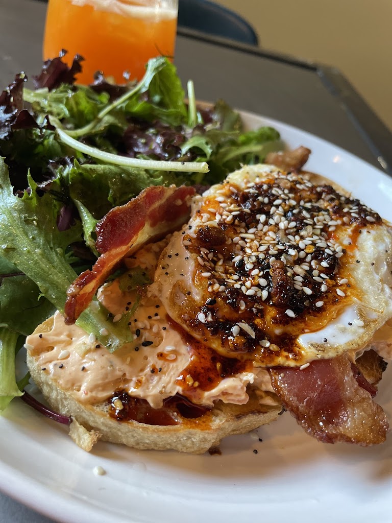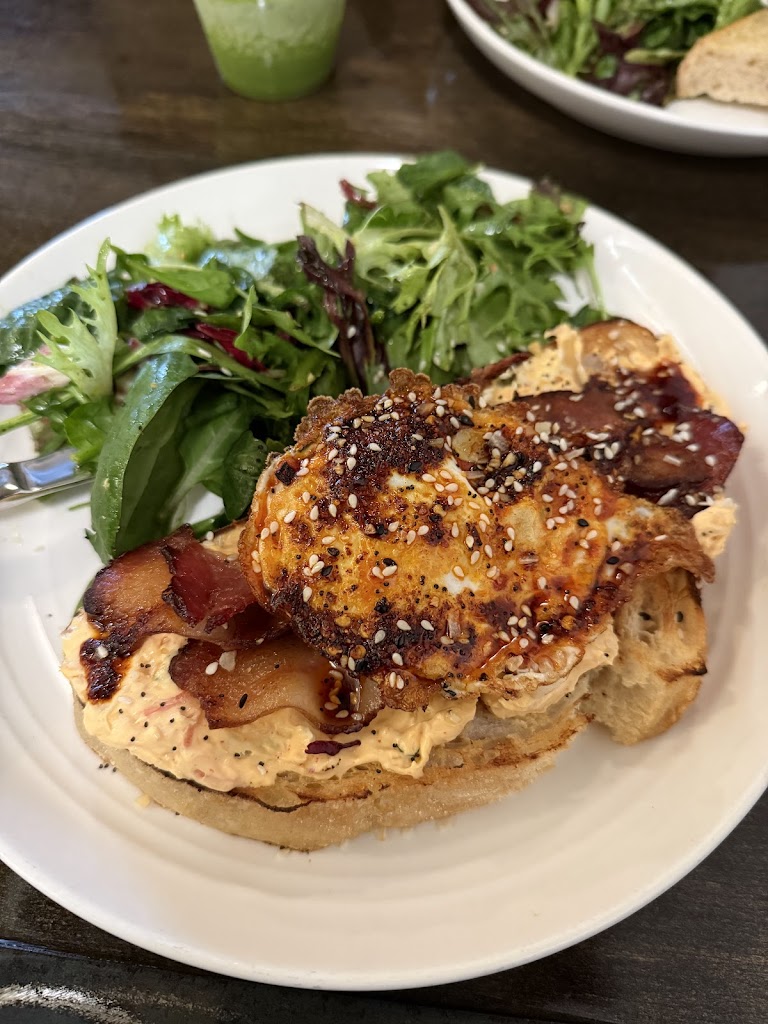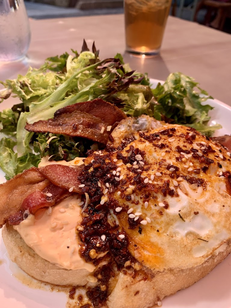 We ordered the Kimchi Toast with kimchi cream cheese, thick cut bacon, fried egg, chili crisp, dressed greens, grilled sourdough. Honestly, this was 10/10. A little messy to cut up, but holy cow the flavor…