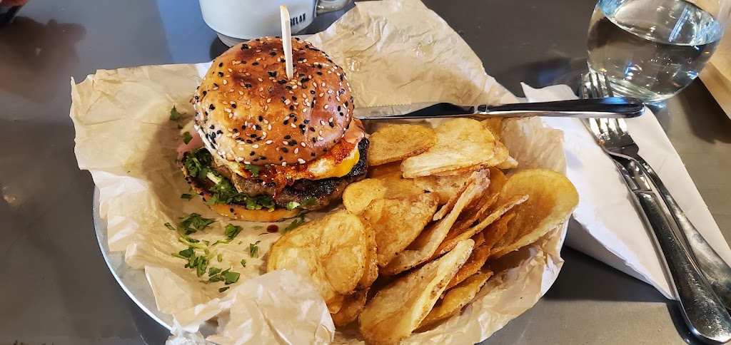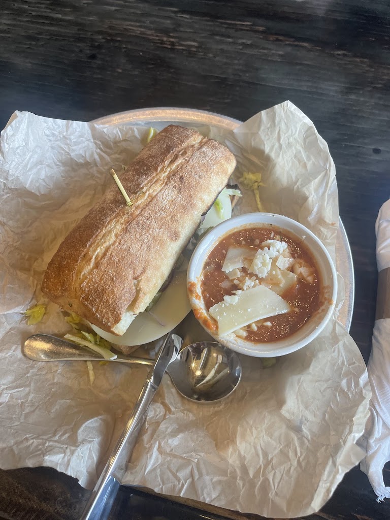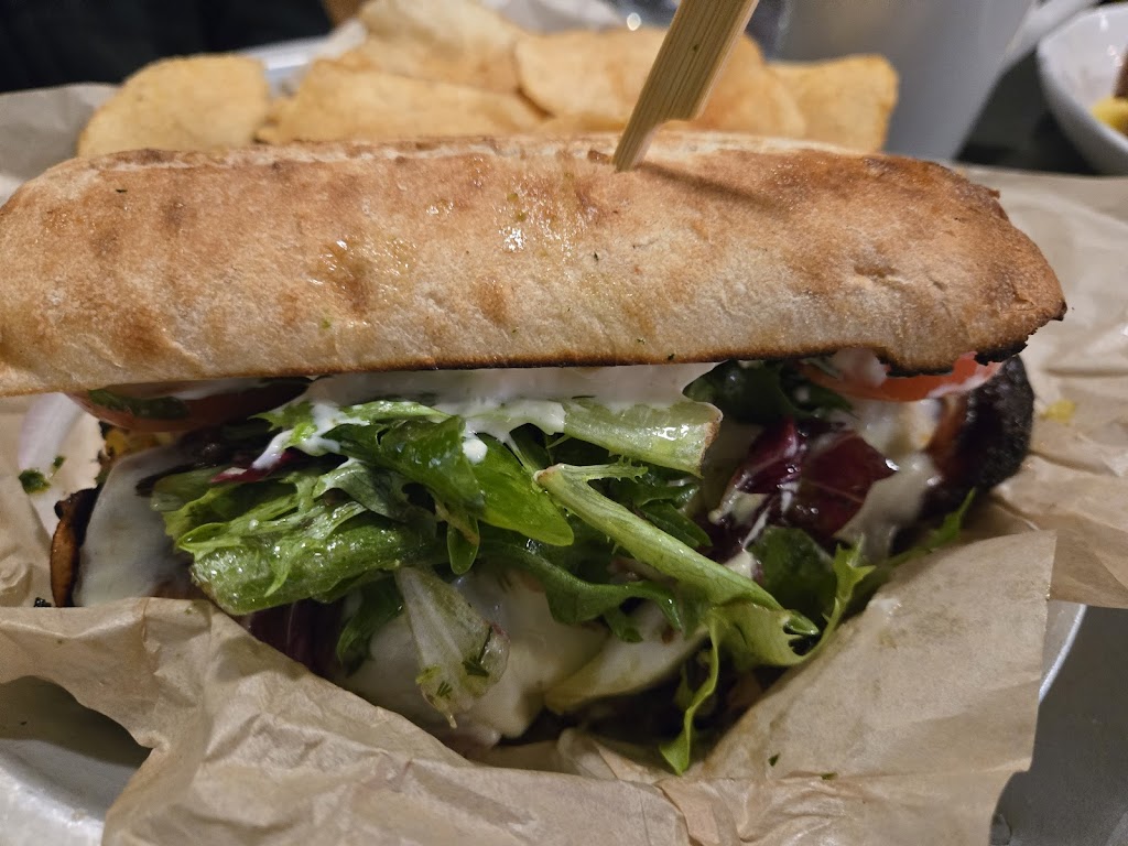 I ordered a grilled chicken sandwich — it was super tasty. It came with soup. I got a cheesy potato soup with dill, possibly cauliflower — incredibly flavorful! The atmosphere is lively and youthful, the place was packed during lunchtime. I waited about 10 minutes for the food — pretty fast considering how busy it was. The interior design is stylish, and the staff are friendly and welcoming. Definitely one of the best spots around.