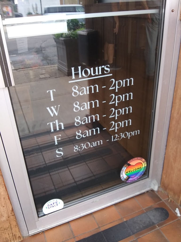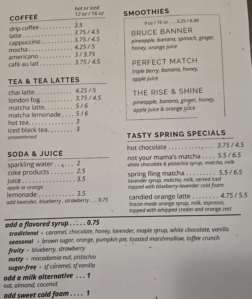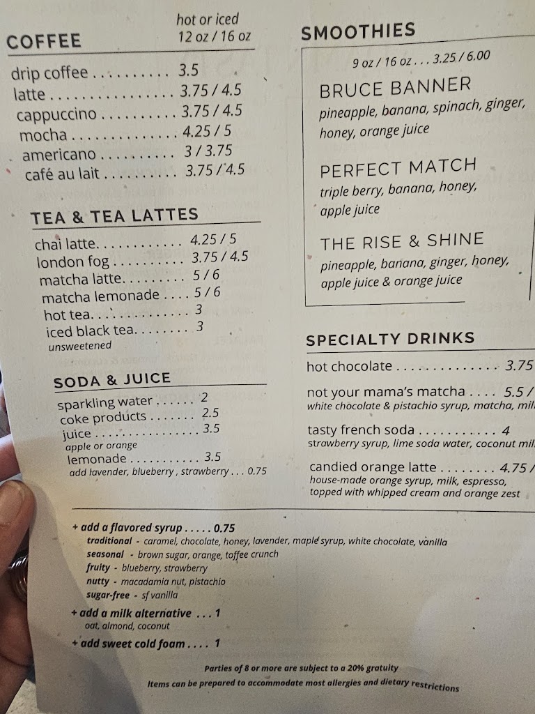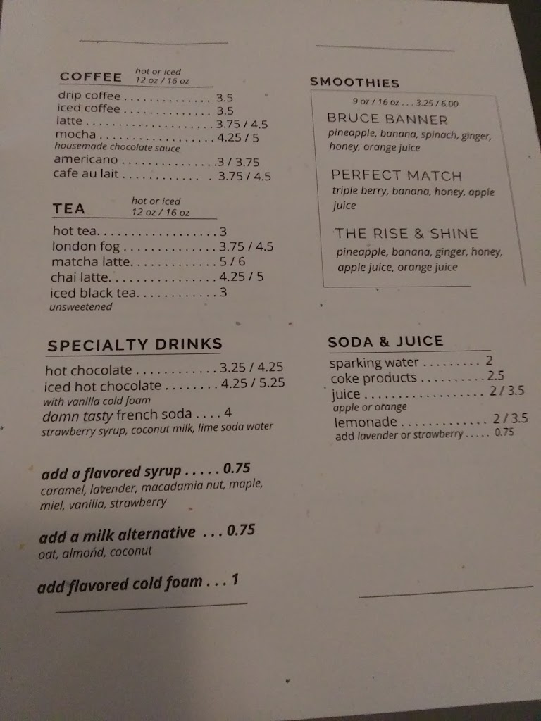 My couple suggestions: maybe doing a few things à la carte or a basic-ish dish, the menu is great but def foody geared…the area def warrants a few basic items. Maybe laminate the menus, and mention checking daily pastry and coffee specials, and better signage in front because all you see is the ugly yoga awning. OH, and ask people if they are sitting inside or out, so you can have people wait at their tables and staff can call order names inside and outside as well. This will help avoid congesting area near counter and entry!