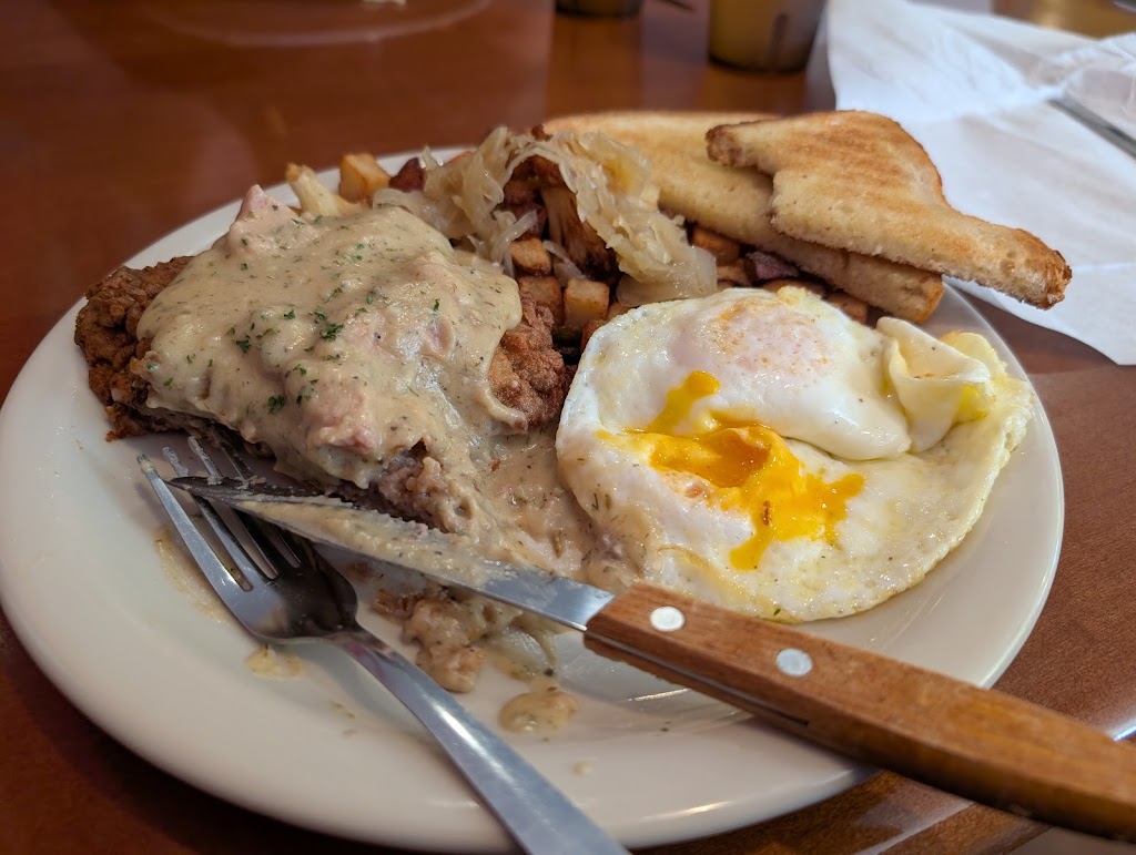 Don't order the chicken fried steak it's horrible. I ordered the chicken fried steak it was horrible and it was $18 for breakfast I will never ever go back there. The waitresses were horrible everything I asked for they never brought me I asked for butter never got it I asked for syrup never got it I asked for to go container never got it