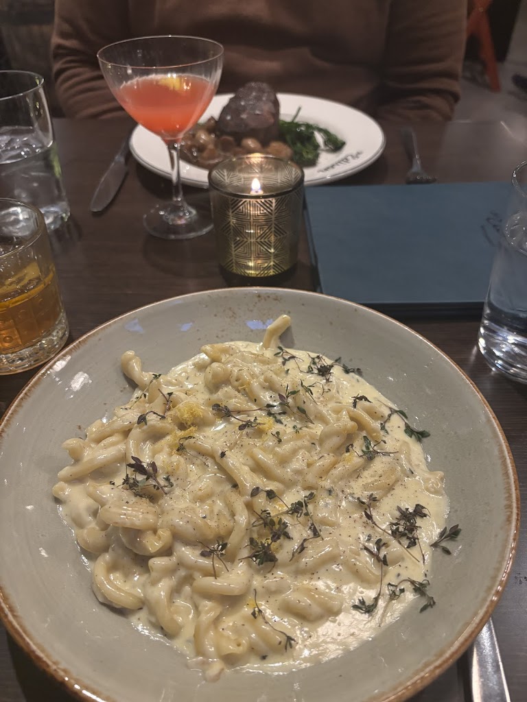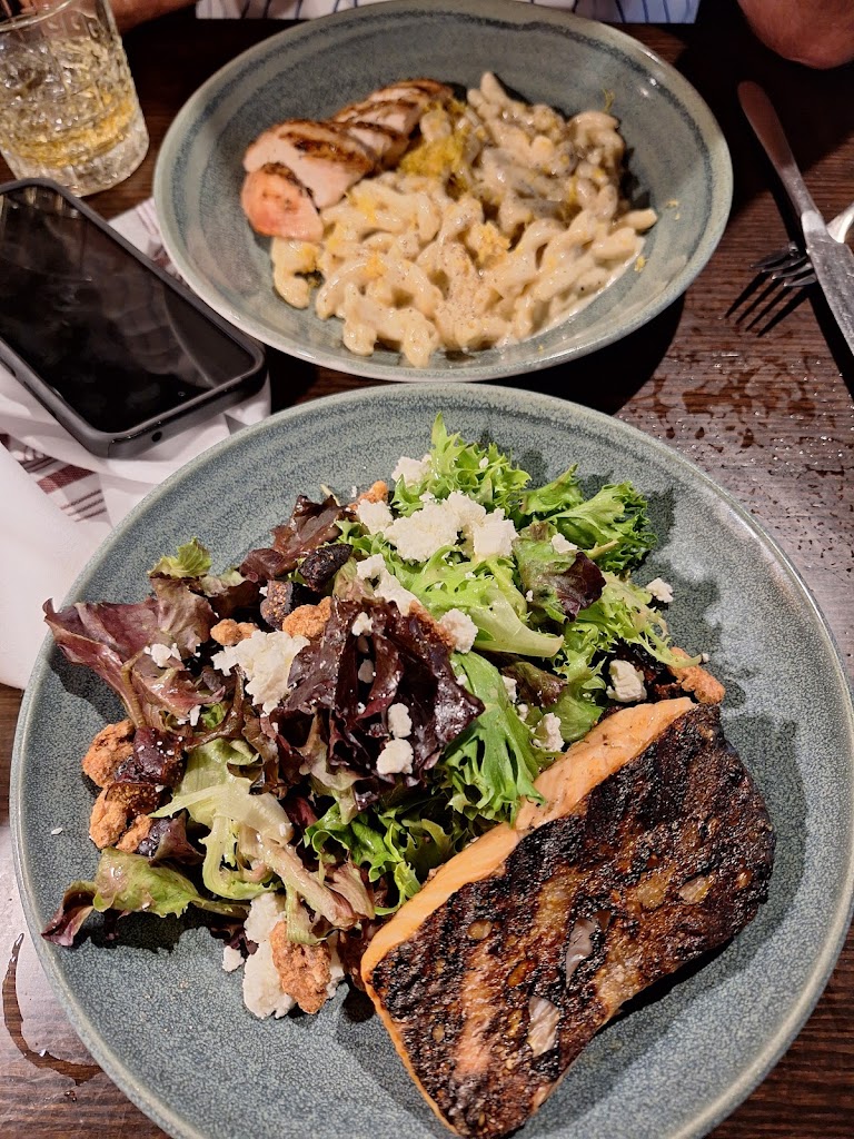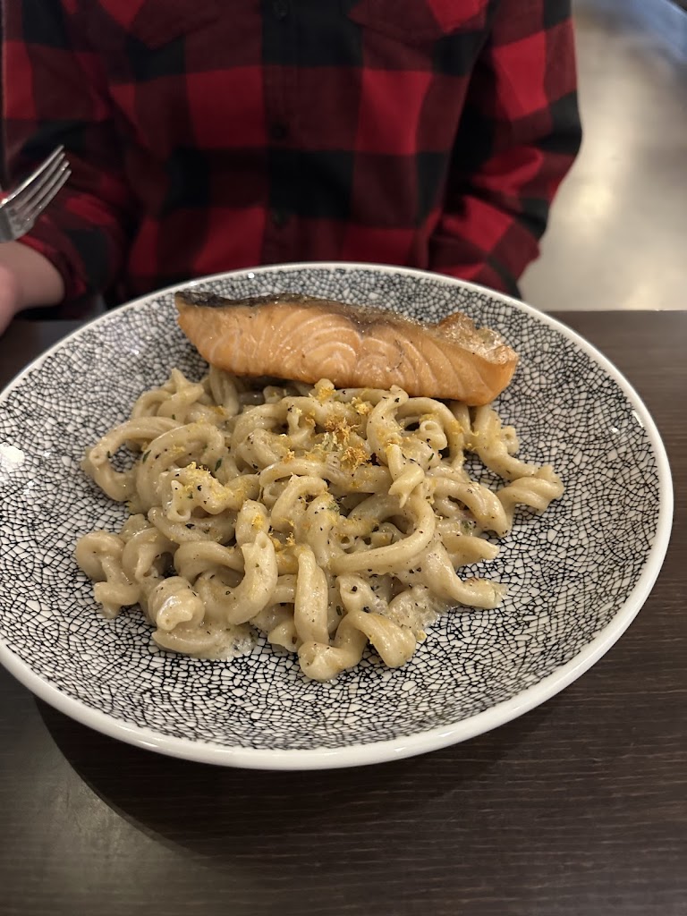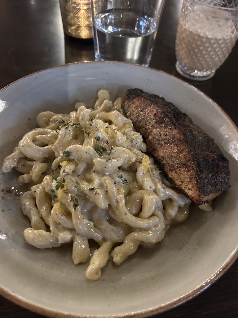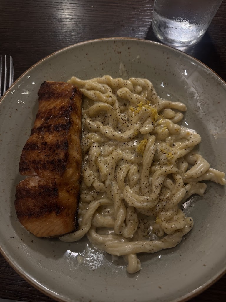 I tried the salmon, which was cooked perfectly — flaky on the inside with a crisp edge that gave it just the right texture. Every bite was rich and satisfying without being heavy. Alongside it, I ordered the celico pepe pasta dish, and it was a standout. Simple in concept, but incredibly well-executed, with silky noodles coated in a creamy, sauce that was deeply comforting.