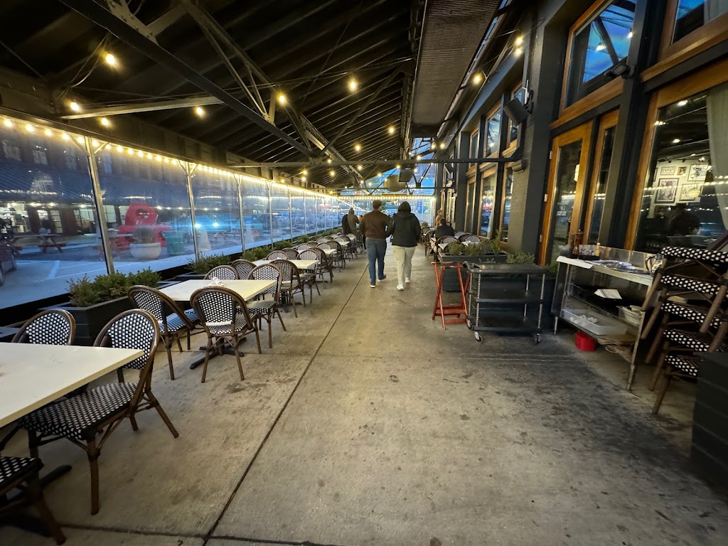 There is seating both inside and out side. The atmosphere is great and high end inside. The service was very good and the food was excellent. Many very good choices on the menu. We all chose very different things and they were all great. Some very cool and creative drinks.