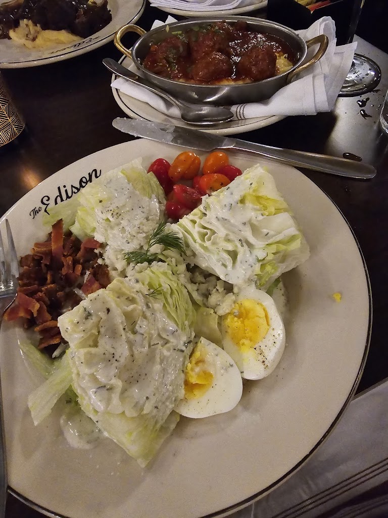 When we arrived to the Edison’s we were greeted by the most accommodating staff. Our server was a lovely lady who provided some stellar drink recommendations. We ordered our entire meal including initial drink orders on our first touch which arguable was a bit late but the husband and I had looked at the menu ahead of time so completely fair. Our drink and appetizer food was served in a timely manner. I did mention a gluten intolerance as a side conversation to my husband in passing and our server instantly caught on. Not only did she ask if she could pass that on but came back 30seconds after our order to ensure we knew that something we ordered was not gluten free. Unfortunately the service was the only good things I have to say about our evening. The first few sips of my birds in paradise were sweet but I could taste the flavor profile. At about 1/2 through my drink became extremely watery tasting which is okay if it took an an hour to drink but I had the drink within 20 minutes of service so not sure if there was a mixing error. However my husband had a very similar experience with his ruby highball also started out as fantastic in the first 3 sips. The food overall was terrible. We had the meatballs which were STELLAR and the highlight of the evening. My husband had the French onion gnocchi which was French onion soup with boiled gnocchi baked with an excessive amount of unseasoned cheese (sadly we had to literally cut the cheese…with a knife to get through). We also had the coal fired wings. It was very clear there was in intricate dry rub on these which included thyme, paprika and Garlic. Unfortunately, none of these flavors, or any flavor, actually came through on the wings. Also there was certainly no charcoal flavor either. It was rather baffling to see these herbs and spices and not taste them. Unsure of the quality of ingredients is too blame…I then had the scallops which I was rather excited about since I love them but rarely trust they are up to par or provide a good entree. I regretted my decision almost immediately. The best things about the scallops dish was the charred allium spread. The scallops were cooked well but must have been old or lower quality as they were exceptionally fishy (I eat things like oysters, muscles and clams regularly so am not afraid of a fishy taste). The mushrooms on the plate were rubbery and dry. They did not fit with the lightness of the dish at all. There were raw purple radishes which were not enjoyable and also made no sense with the lightness of the dish. The micro green salad was overdressed or included chive micro greens lending an unpleasant onion base. And then there were the rice pucks… cakes .. which were one of the worst things I have tasted in a long time. That said if you like unseasoned rice balls with undercooked forbidden rice this may be the dish for you. My husband had a double cut coal fired durrock porch chop which was cooked to a perfectly well done state, cheddar grits which may as well have been chicken stock rehydrated polenta with no salt, and an under reduced door county cherry jus which may have been cherry water I am a little unclear. There was a slaw on the dish which was tasty. We did have a ricotta cheesecake for desert which I highly question if that was made by the establishment. This was decent but not special.