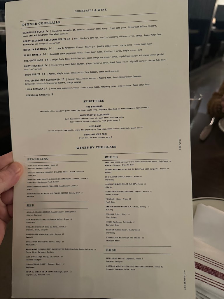 Absolutely love The Edison!! Delicious food!! Fantastic staff!! I had Michael the bartender he was so awesome and helped me on my decision for food!! The glass that they have for wine is amazing!! Crystal from Austria with a thin lip. Can’t tell you how much I love this place!!! The atmosphere is beautiful!! A must to make sure to go to!!