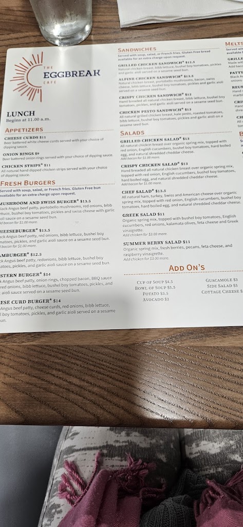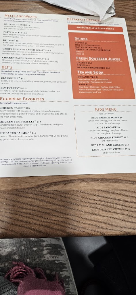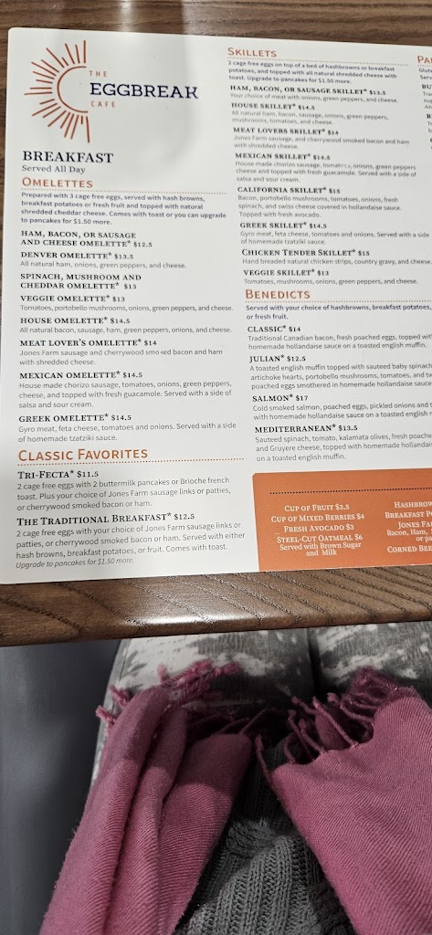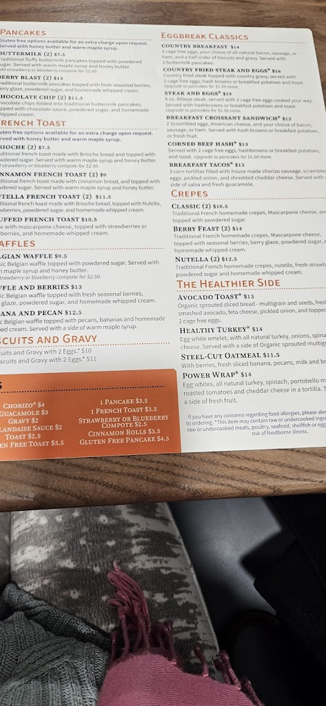 Eggbreak’s food and our server were fantastic. Unfortunately, a busser dropped a full tray next to our table—syrup, plates, and glass everywhere, splashing two of us. Staff apologized but didn’t offer any real compensation; only after we asked did we receive a single $20 gift card on a $150 bill, no cleaning offer. Accidents happen, but guest recovery matters. Hoping management revisits its policy so great servers aren’t let down by a weak response to mishaps.