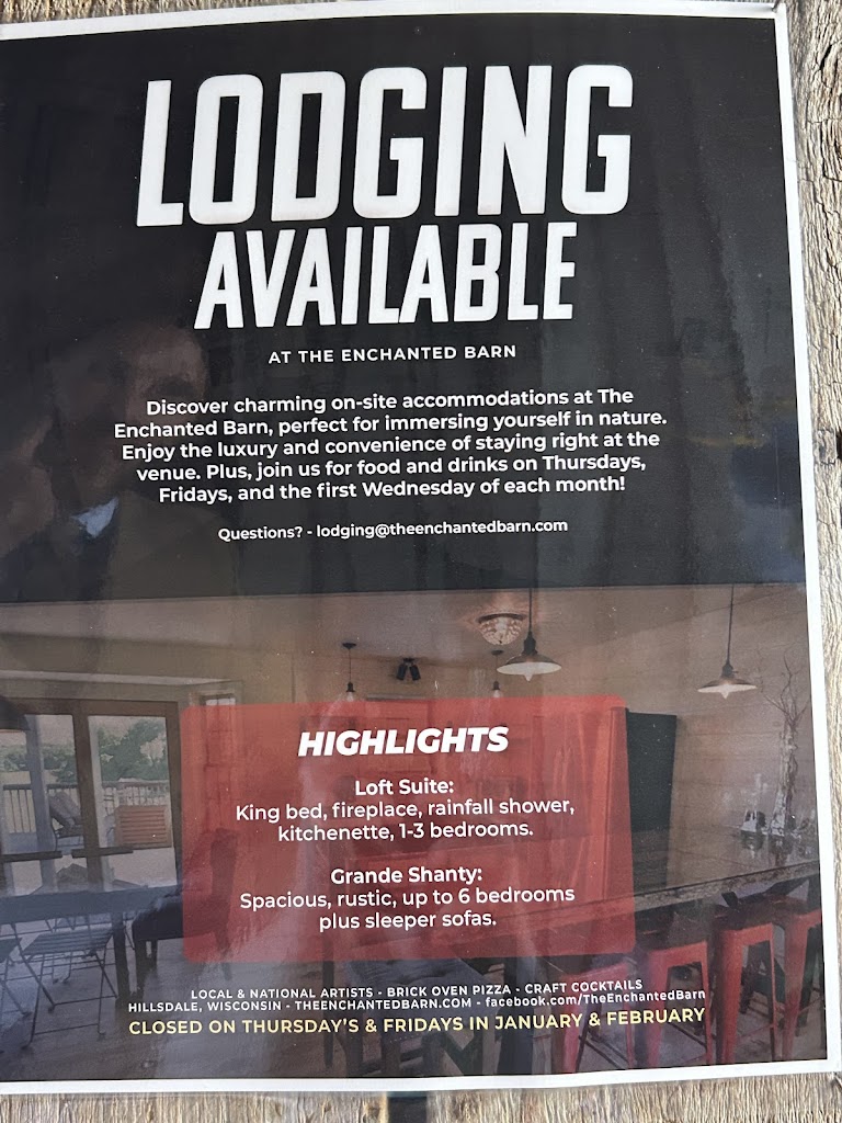 Enchanted Barn is a quaint, wonderful place to experience! Out in the countryside, the barn is beautifully designed in a rustic manner by the owner, Lauren. He even took us for a tour of his lovely appointed suites! Walk around and explore the serene surroundings! There is a surprise around every corner. The wine and drink menu is expansive and the oven fired pizza has a wide variety of unique combinations. The crust is homemade and the flour is from Italy. We ordered 4 pizzas and every one was amazing. We absolutely loved this place!