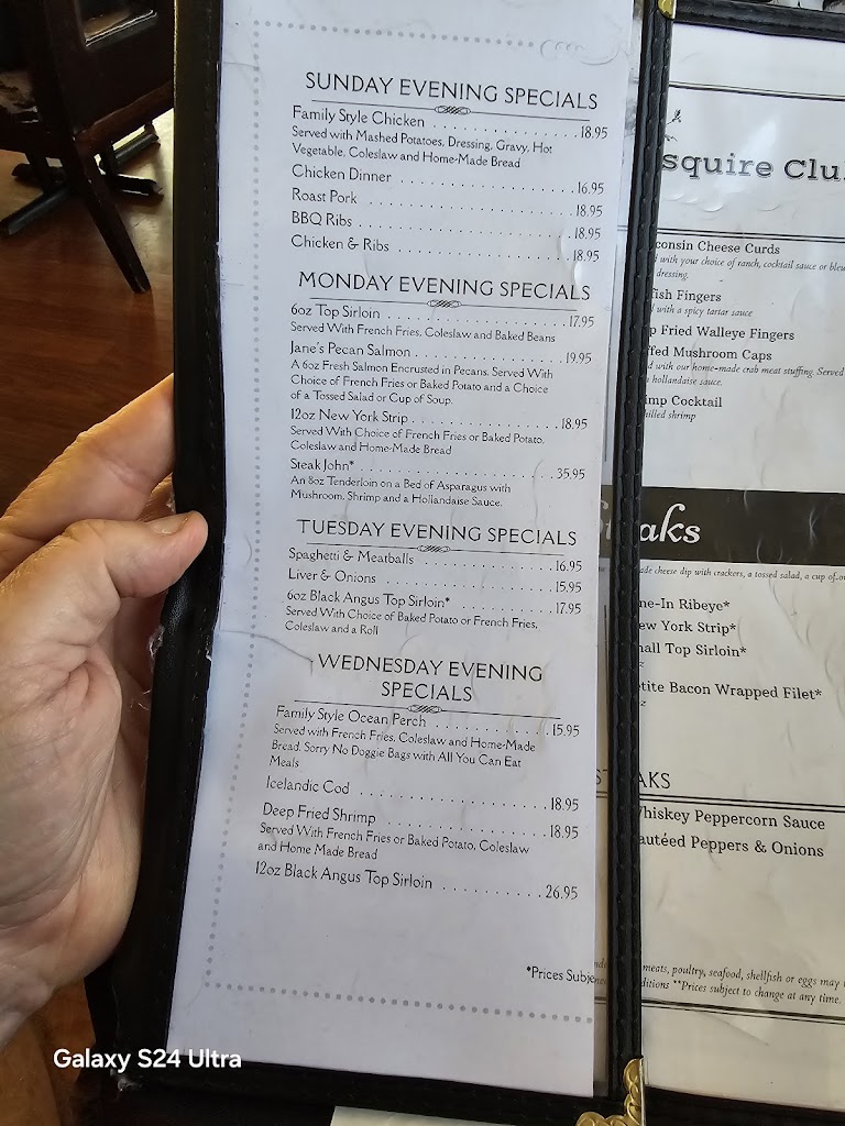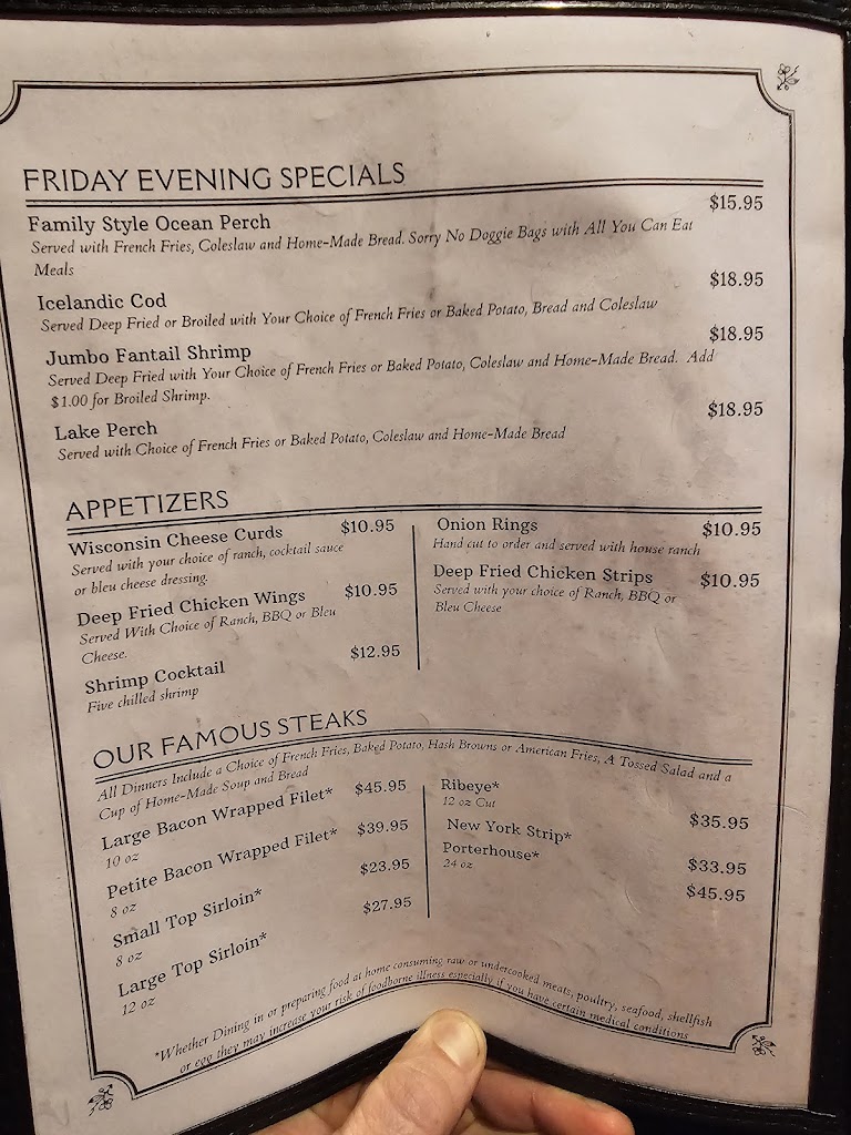 Wonderful Wisconsin Supper Club! The food has been excellent including their Sunday Southern Fried Chicken! Took guests fro out of town here, and everyone was very pleased with their meals. Cannot go wrong here!