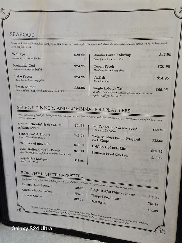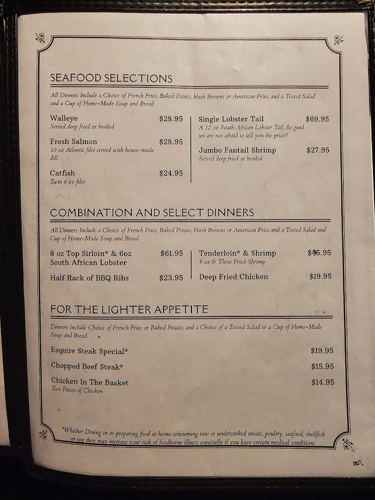 Place is in serious need of an update. Fish was good, steaks were tough. Good soup and salad.
