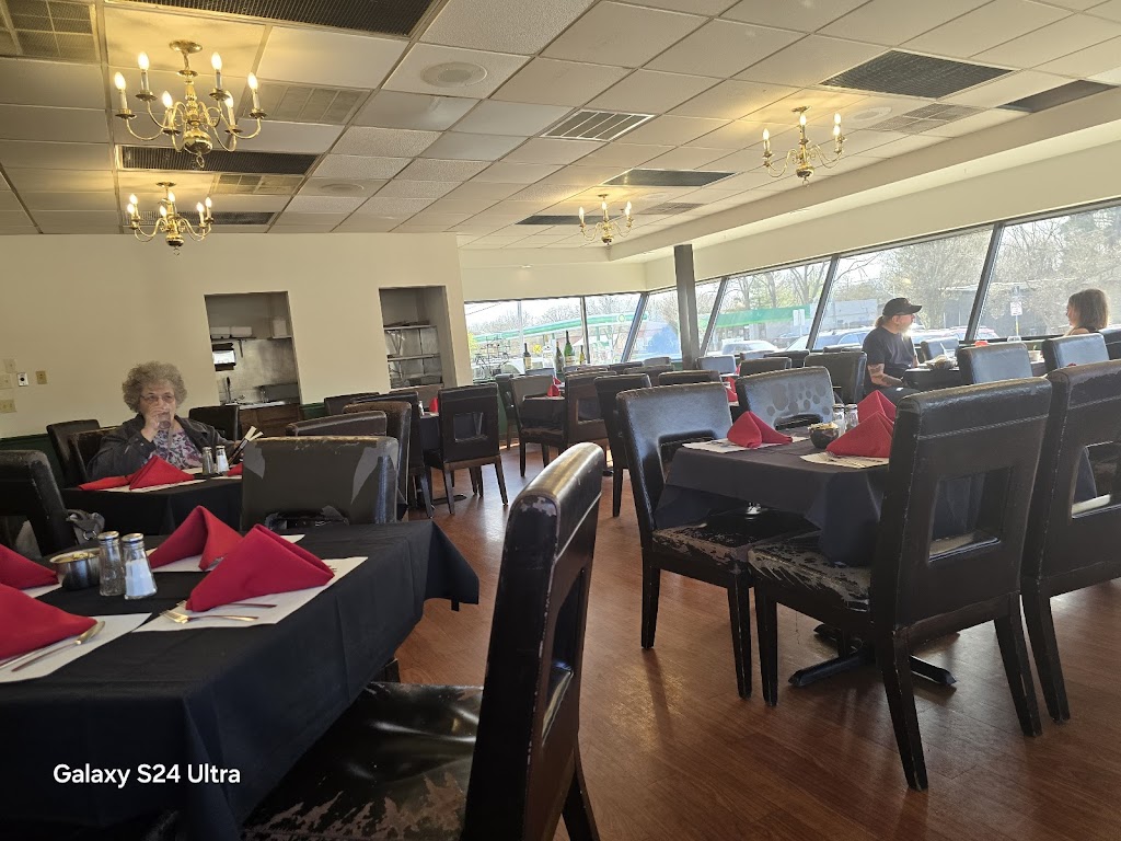 Very dark inside. Dark walls. Boring walls and carpet. Needs an upgrade badly! The food is not worth the prices charged. Both of our chairs wobbled. Thought I would fall over. December 22nd and no Christmas decor in the banquet room.. I never want to eat here again!