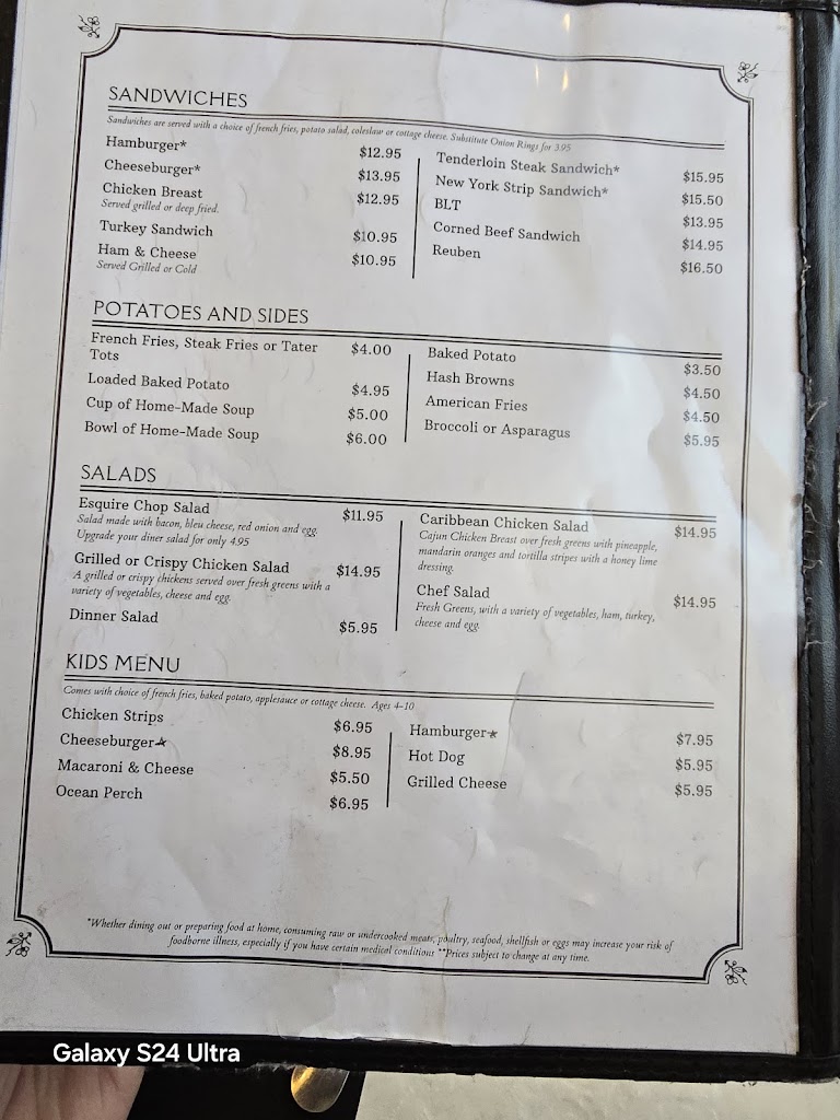 Our neighborhood group goes to the Esquire quite often. The Friday night fish fry is always fun! The fried ocean perch is delicious, does not taste fishy! The fried jumbo shrimp are outstanding, so huge! They always give us generous amounts of coleslaw and bread, plus you get a baked potato or french fries. Lots of food to eat! Our server, Michelle, was very friendly and very efficient. And with 18 of us there, the service was outstanding!