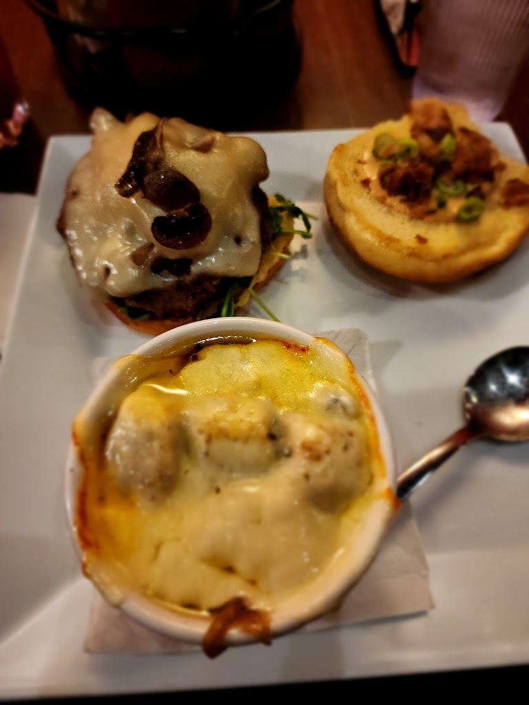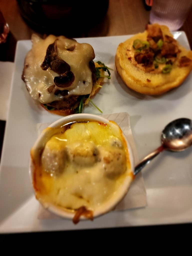 Tried two beers before settling on the Kombine. Good suggestion. Got the house burger with the soft fried egg. Okay flavor. Waffle fries were too greasy and probably overcooked.