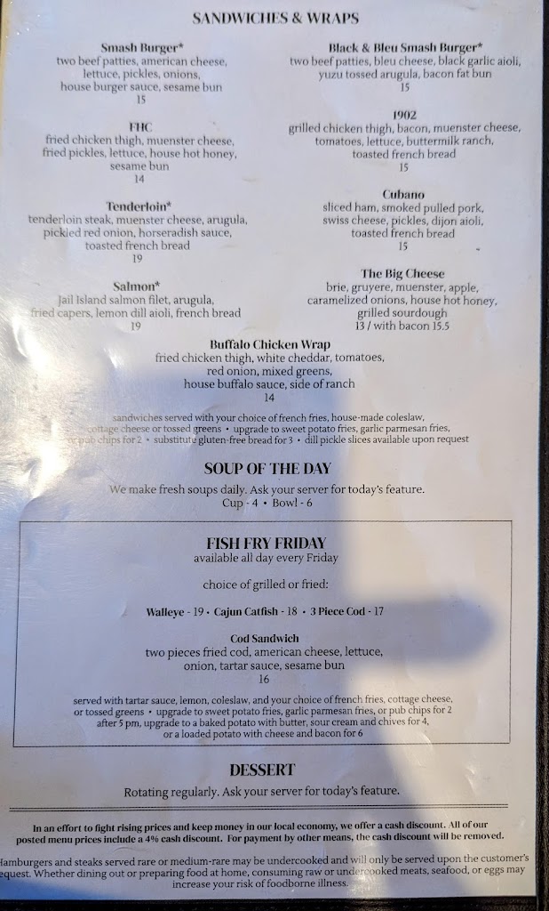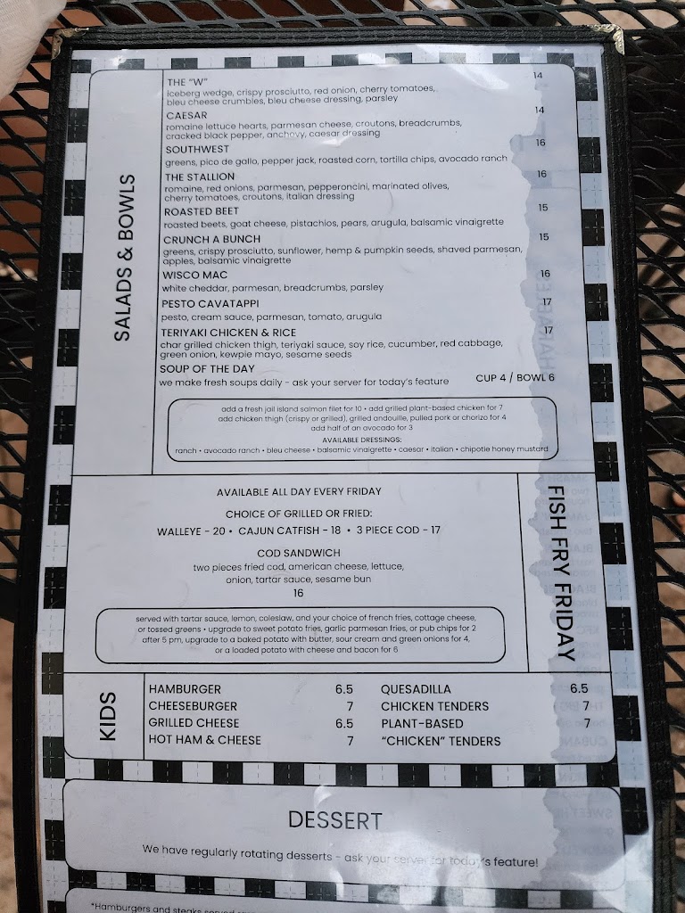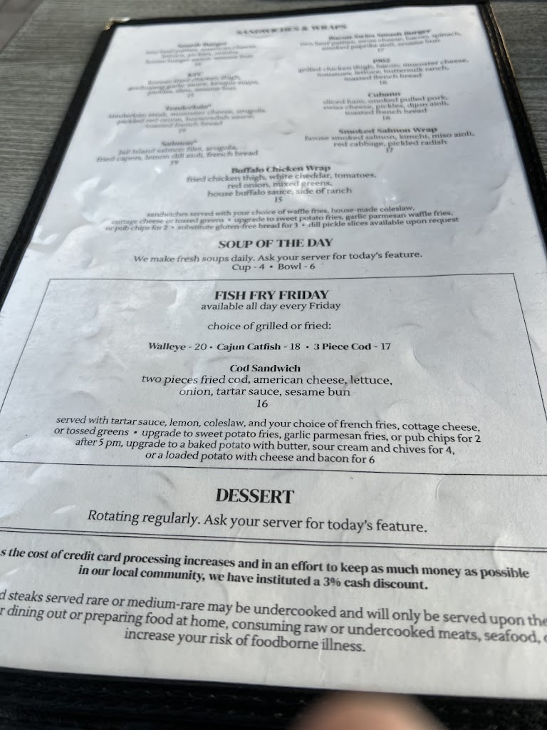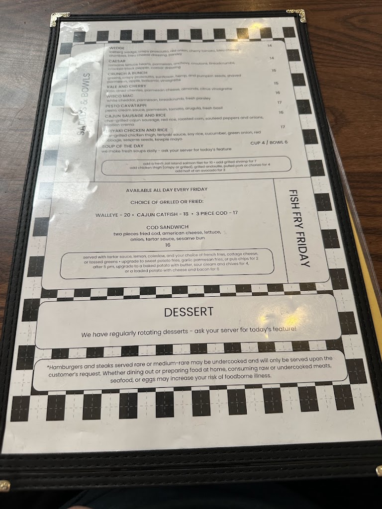 Ordered the walleye fish fry platter and a spotted cow beer and food came out fast and it was amazing. I sat at the bar and the staff was very friendly and funny. They all worked well together and it made for a very enjoyable meal. Recommend 100%