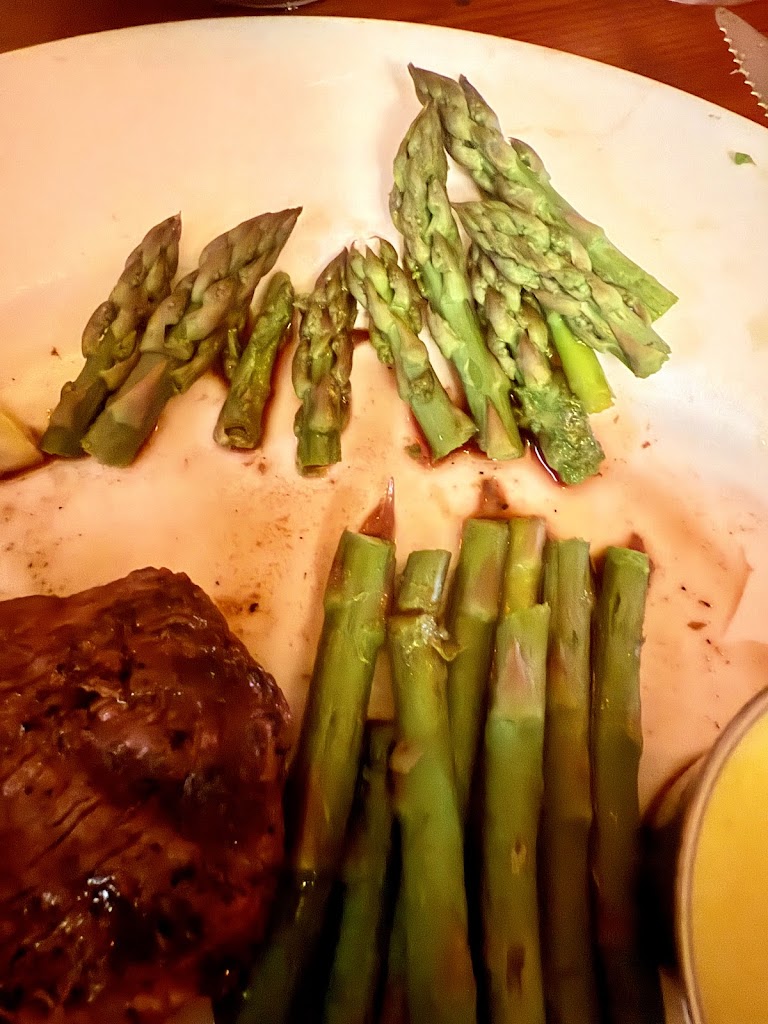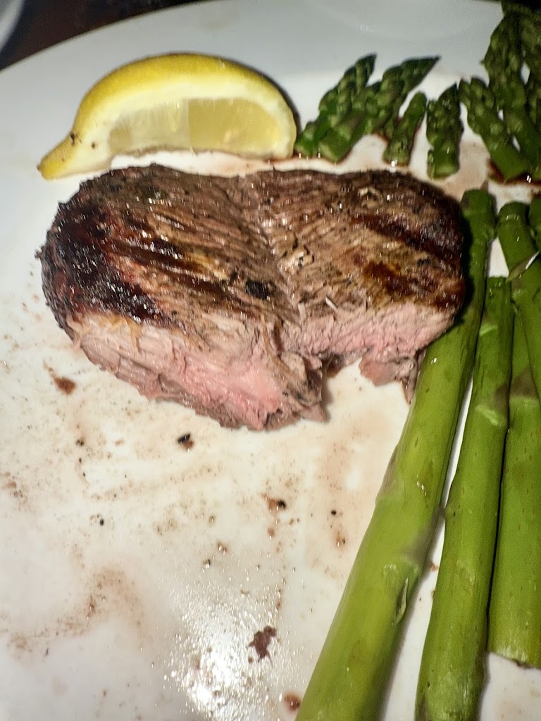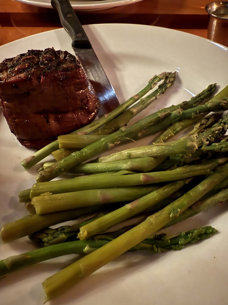 Both of us had steaks; the peppercorn strip was overcooked, tough and underseasoned. Filet was cooked perfectly but woefully underseasoned. The side of asparagus was cooked very poorly - wilty tops and woody stems. Not worth the up charge.