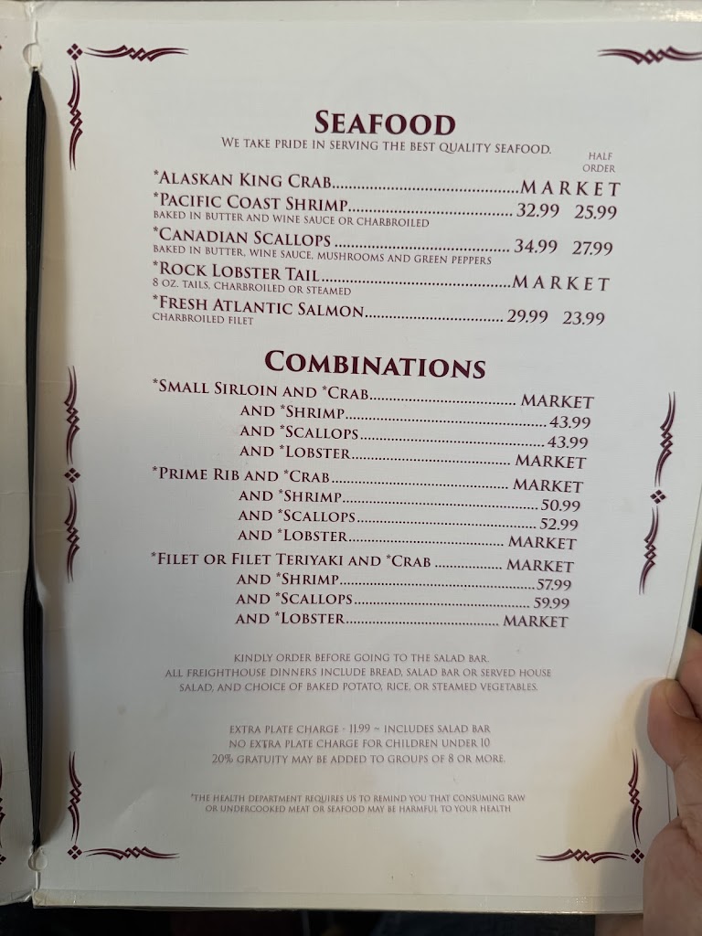 Very nice place, good salad bar, ordered prime rib nice size for the money ordered it rare came out medium that was ok not the best flavor a little on the tuff side but it may have been a bad cut that will happen I will come back great cocktails and great service