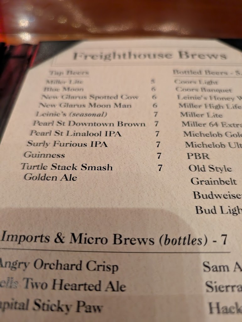 Freighthouse is a LaCross standard. Steaks are big and very flavorful, salad bar and seasonal salads are always fresh, and the seafood is also excellentt. I got 12 oz. prime rib this time (although my actual steak was more like 24 oz.). It was cooked exactly medium as ordered. I paired it with a local Spotted Cow draft and it was hard to beat. My dinner guest got the grilled cold water lobster tail and it was perfect. Our server was super attentive and did a great job as well. I highly recommend!