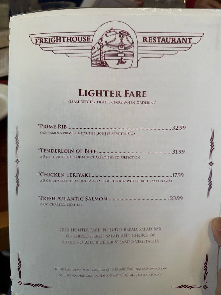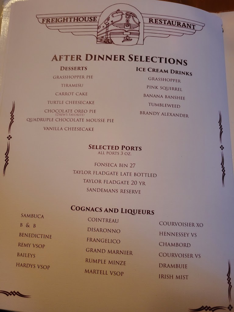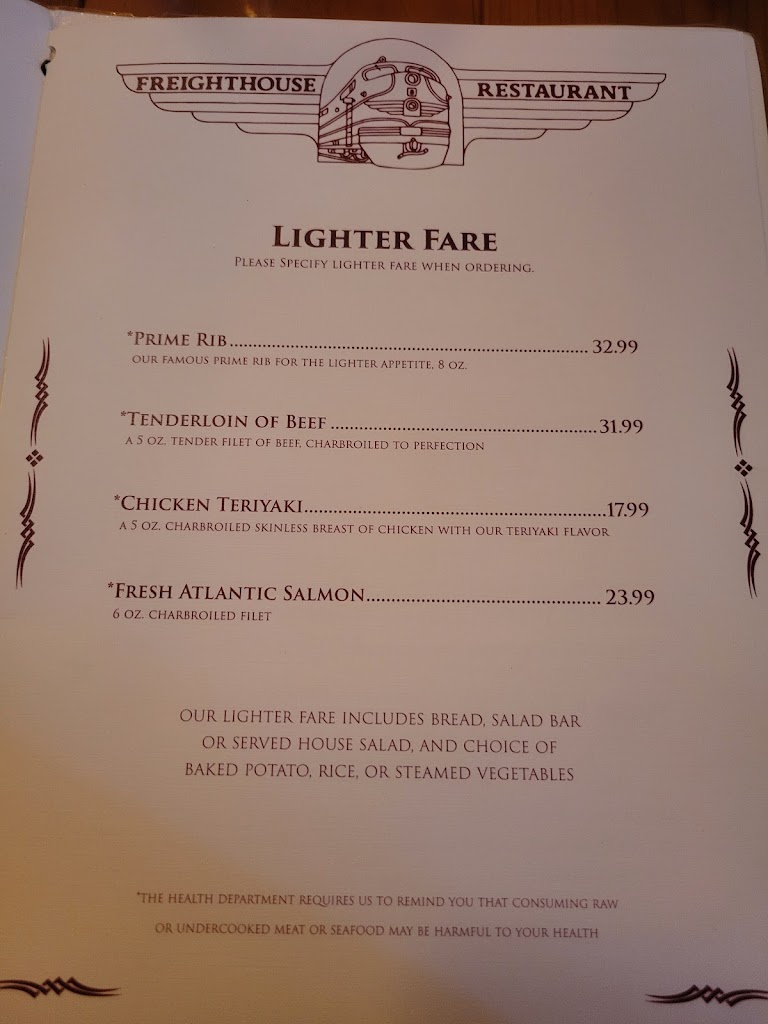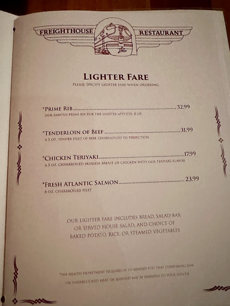 My husband had the prime rib, and it was perfect. I had the 5oz tenderloin, also perfect. Great salad bar, great rice pilaf, GREAT old fashion! Thank you, Freight House owners and staff, for your dedication to this establishment. Great visit!! Keep up the good work.