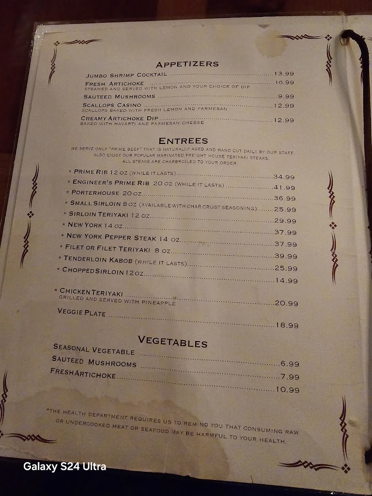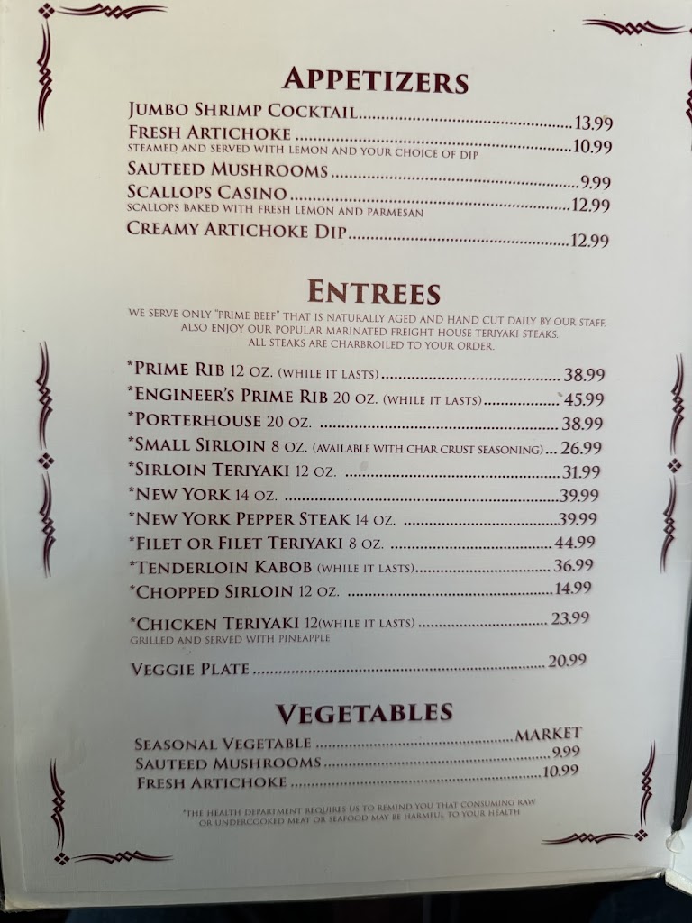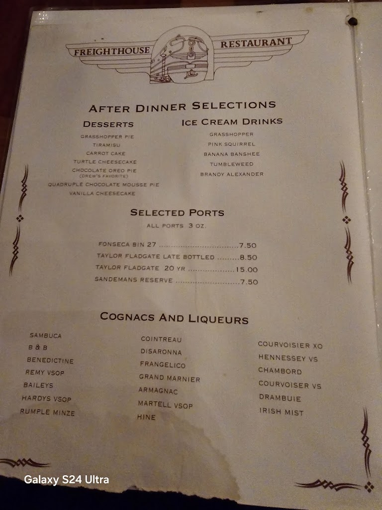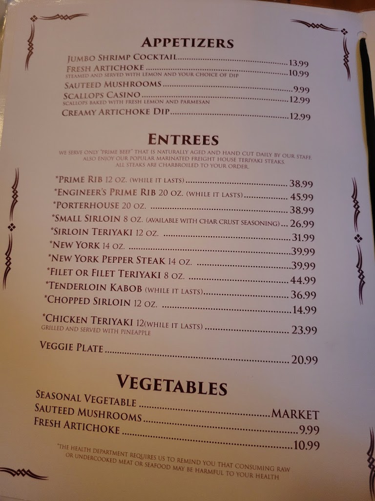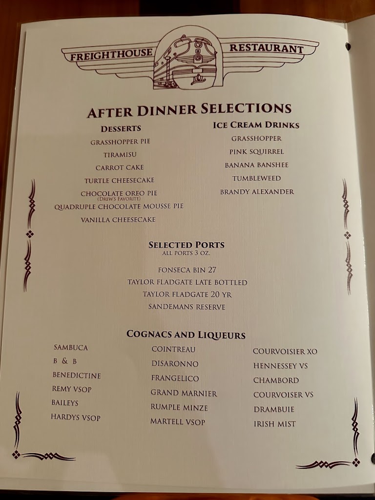 My husband had the prime rib, and it was perfect. I had the 5oz tenderloin, also perfect. Great salad bar, great rice pilaf, GREAT old fashion! Thank you, Freight House owners and staff, for your dedication to this establishment. Great visit!! Keep up the good work.
