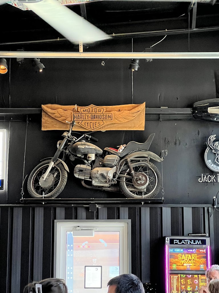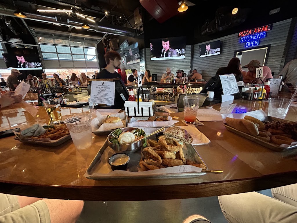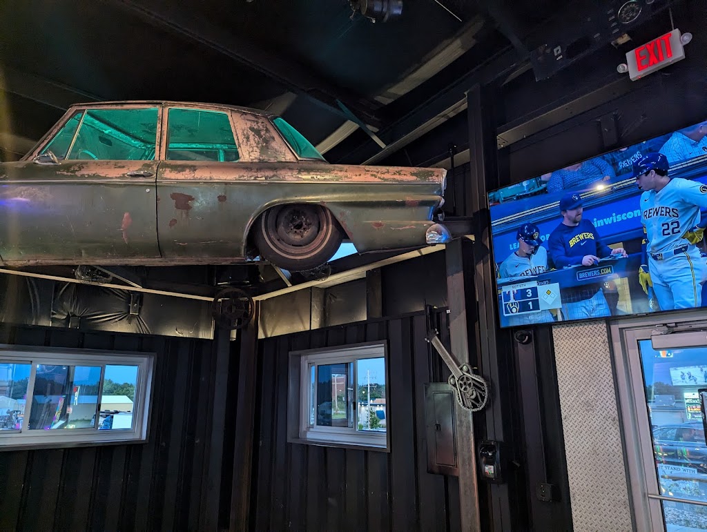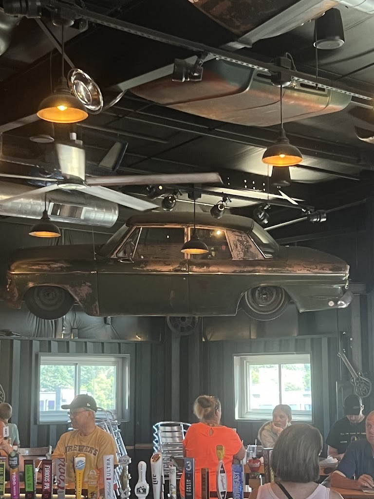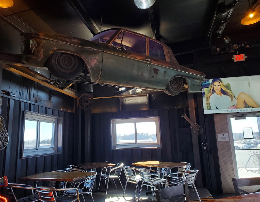 Fun stop while traveling through! Good food and large selection of tap beers plus many other options. Nice patio area, lots of bar/table seating in cool automotive themed bar & grill!