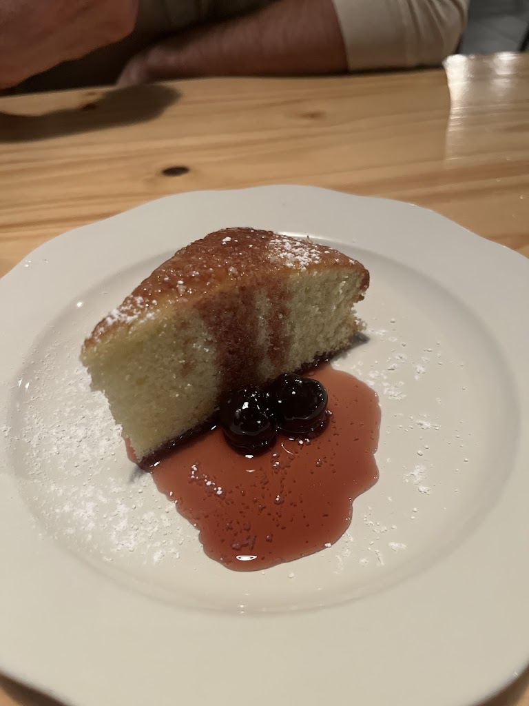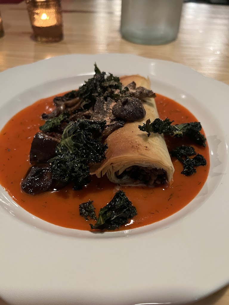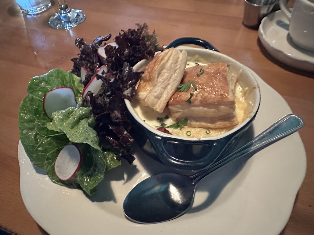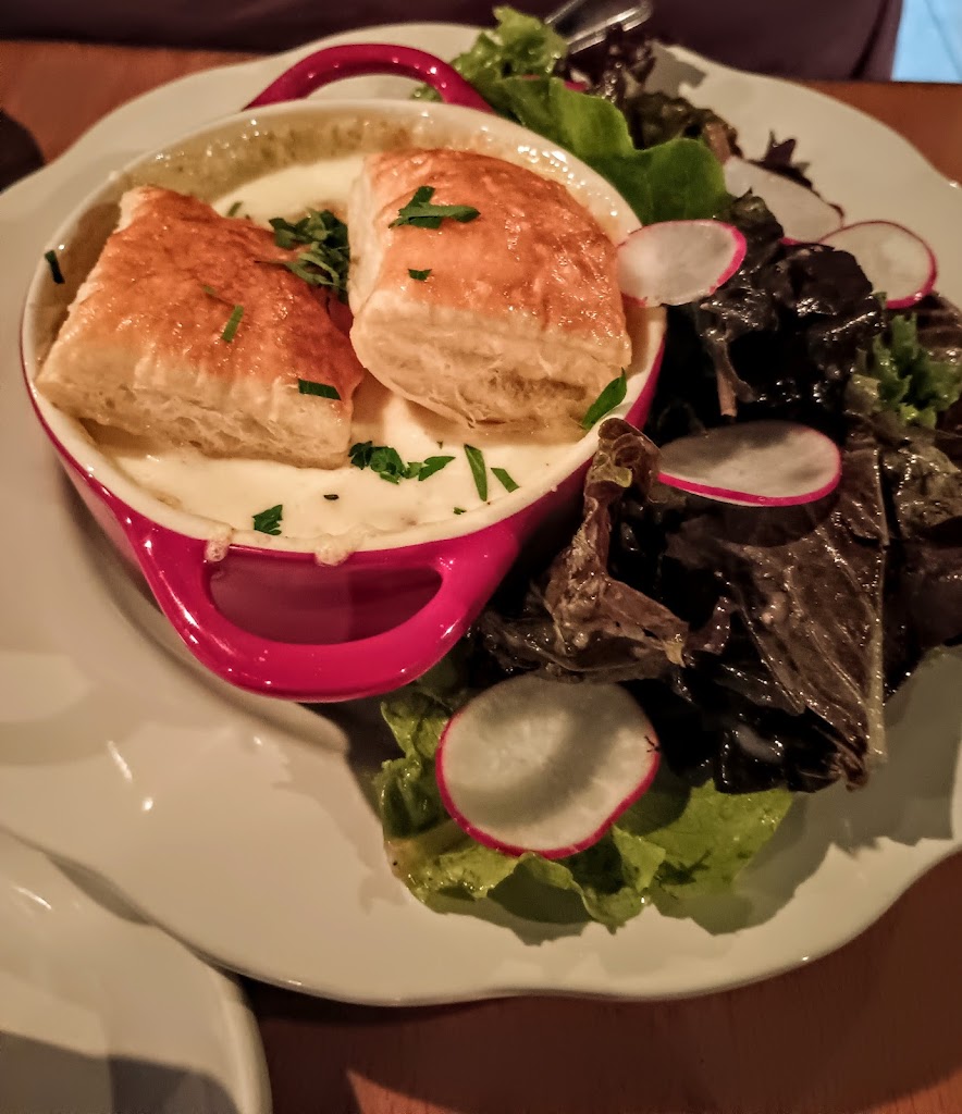 I loved the vegan corn cake entree - rich, creamy yet light, and some nice spice in the vegan sausage. My dining partner had the cioppino, a beautiful seafood dish with a tomato and fennel broth served with crusty bread. It looked gorgeous and he said the flavors were on point.