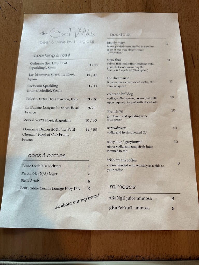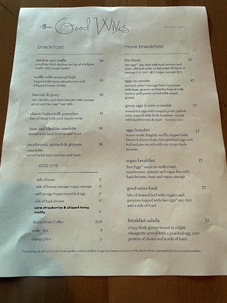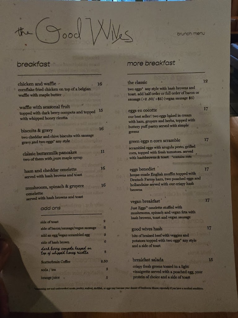 'The Good Wives' is my go to place for a dinner or weekend breakfast. The staff and the vibe create the perfect atmosphere to enjoy the creative and delicious dishes that seem to be so thoughtfully inspired by the season. The menu rotates every few weeks, creating such anticipation each time I walk through their door. The mushroom, spinach & gruyere omelet with their crispy nest of finely shredded hash browns is the breakfast that I compare all others to (no comparison!). The small plates, salads and entrees for dinner have always been great, you honestly won't go wrong with whatever you order. The cod dish with crispy type of herbs and a puree underneath is my all time favorite. Oh, I almost forgot the seasonal inspired cocktails!!...and the panna cotta with red wine reduction, I could go on forever!
