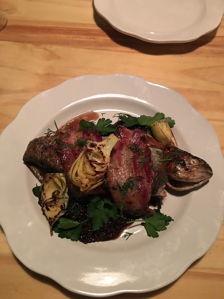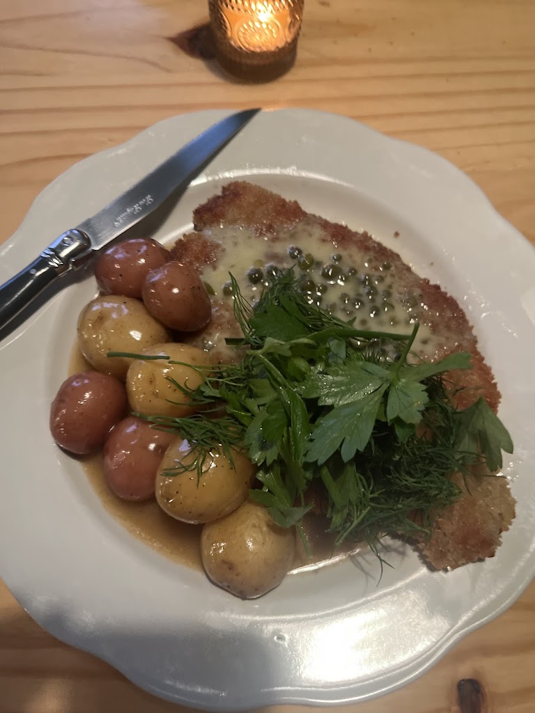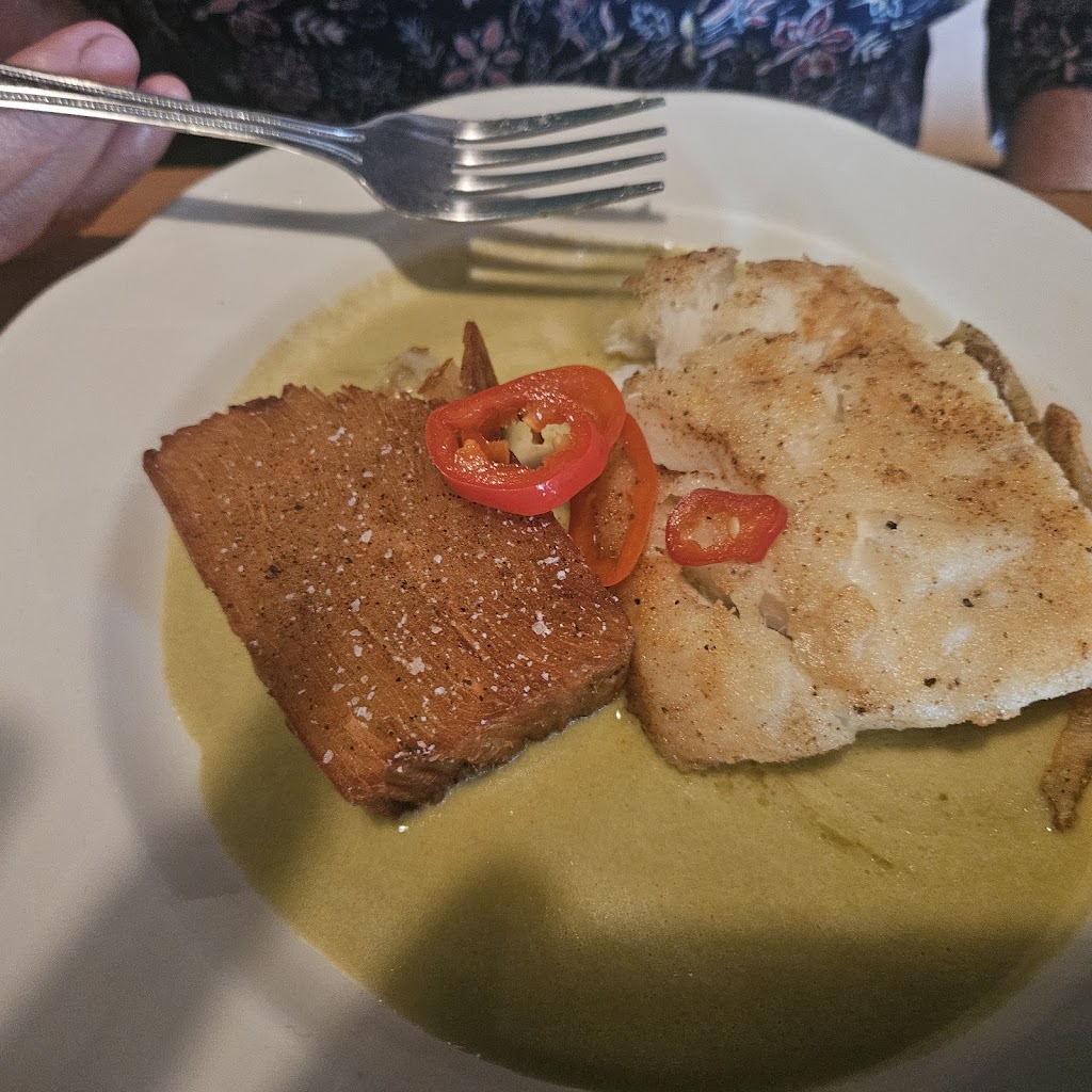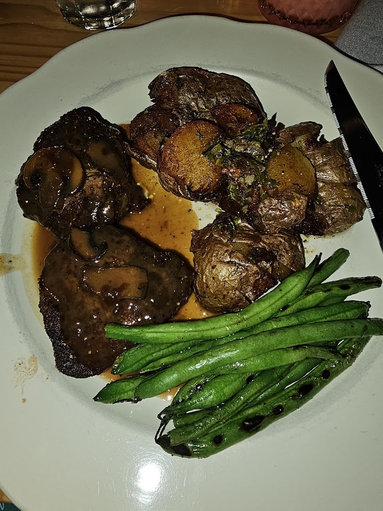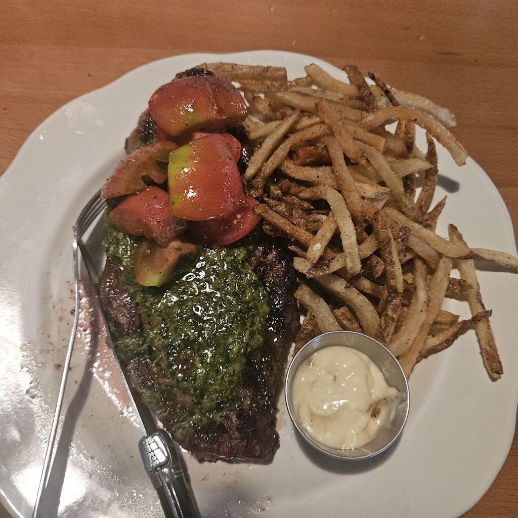 Lovely experience. My ribeye was done exquisitely (MR) and came with an Italian salsa verde (chimchurri) and fresh tomatoes.. frites were nice, a bit salty for my taste . Wife has perfectly cooked cod and potatoes.