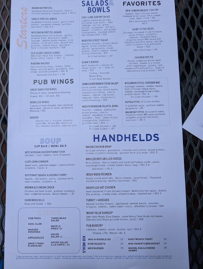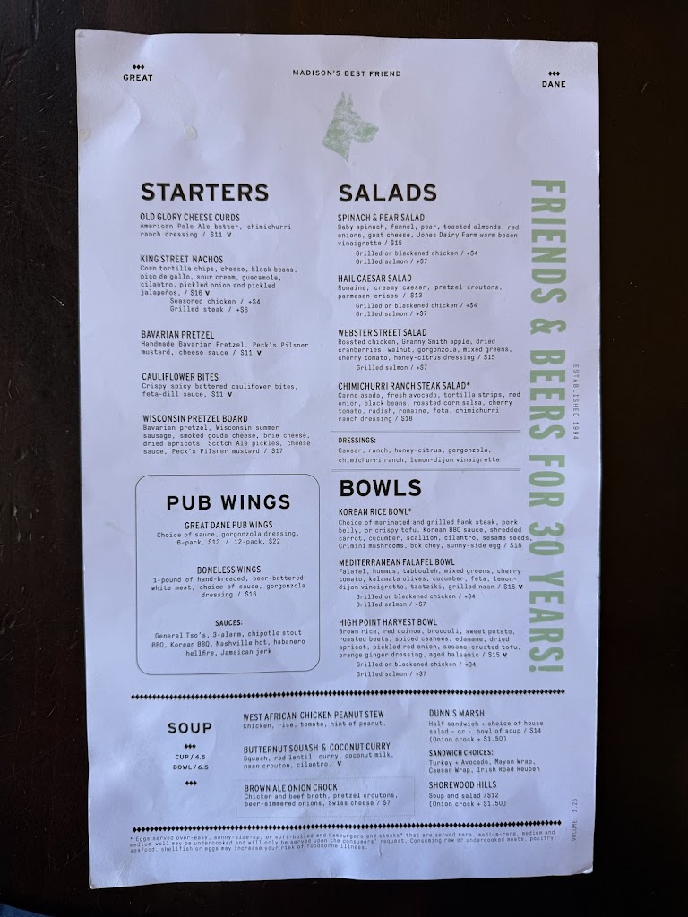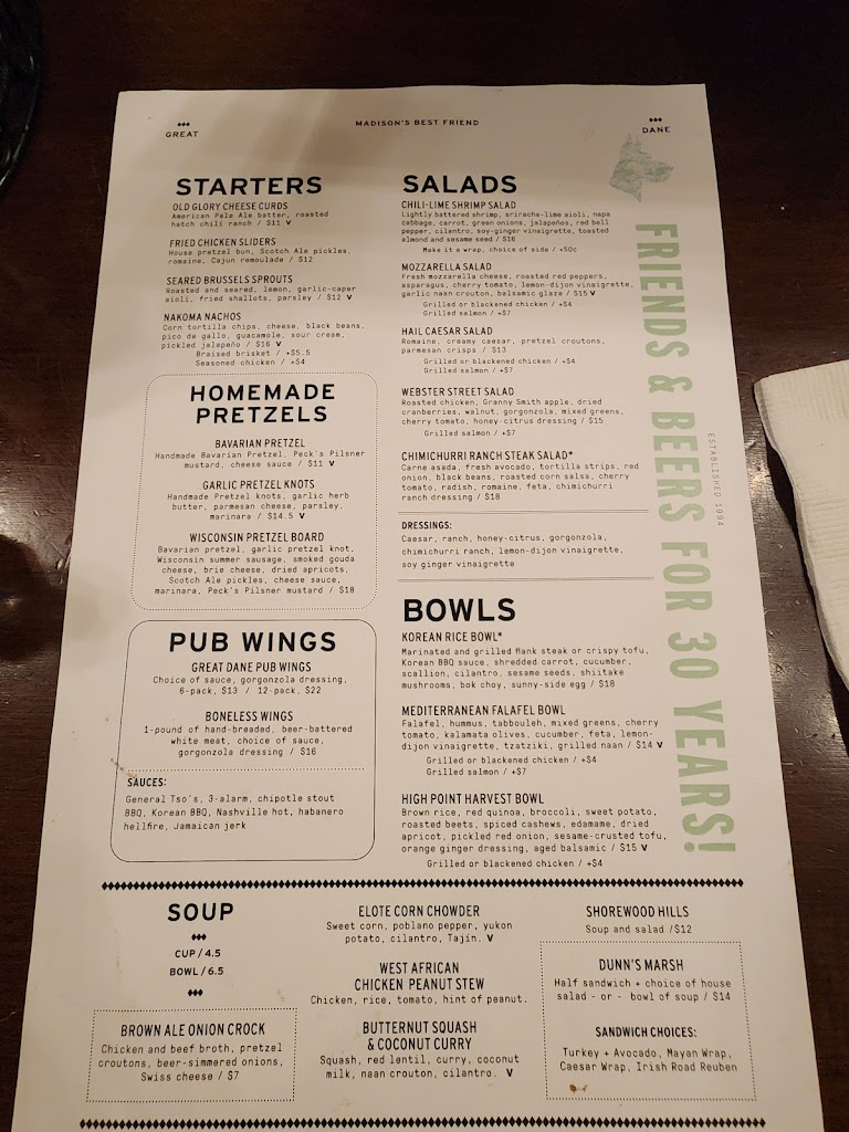 We lived in Madison years ago and loved the Great Dane but it’s really gone down in quality. Our group ordered a burger, sandwich, two baked cods, and two mac n cheeses. The fish arrived cold and very overcooked. The other dishes were just mediocre, not good enough to justify the price. The atmosphere was so loud we couldn’t talk. The only reason I’m not giving the experience one star is because the server was great.