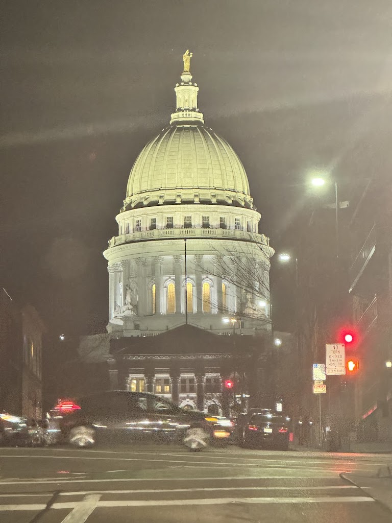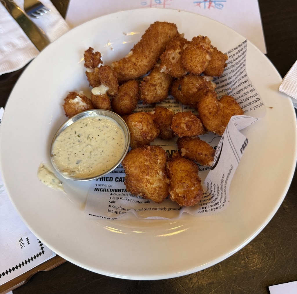 Can’t say enough about this great place. Walked in and was a little nervous because it was very noisy but happily I found the restaurant part was on the other side from the bar! We ordered famous Wisconsin cheese curds which were by far the best I’ve had. Husband got the fish fry which he said was perfect. The French onion soup was incredible. I ordered a salad which was absolutely loaded with all the great things I love in a salad…Granny Smith apples, dried cranberries, walnuts, Gorgonzola cheese and field greens! I’ve never had so many walnuts in a salad ever and that’s my favorite part. Actually we went there because of that salad. So I would recommend this restaurant and driving down there you get a great view of the capitol.