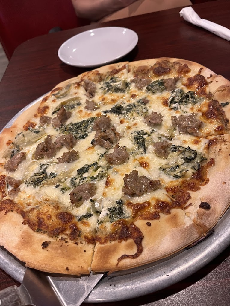 Good pizza and attentive service. got the white owl added sausage. Nice under crust, would come back again.