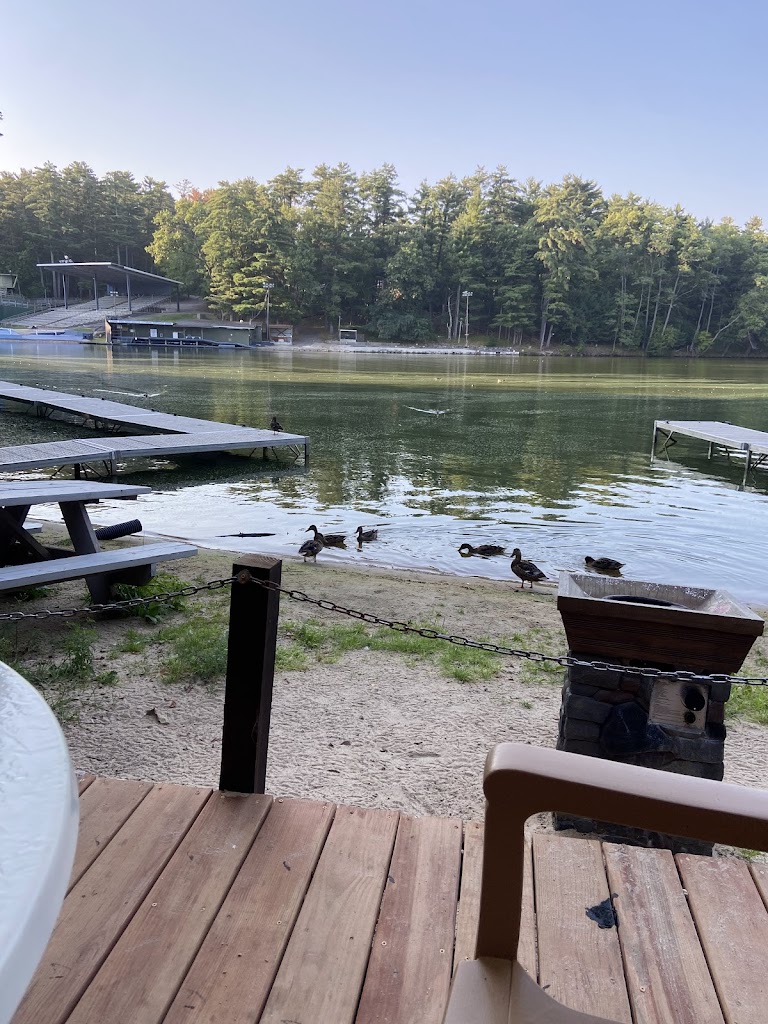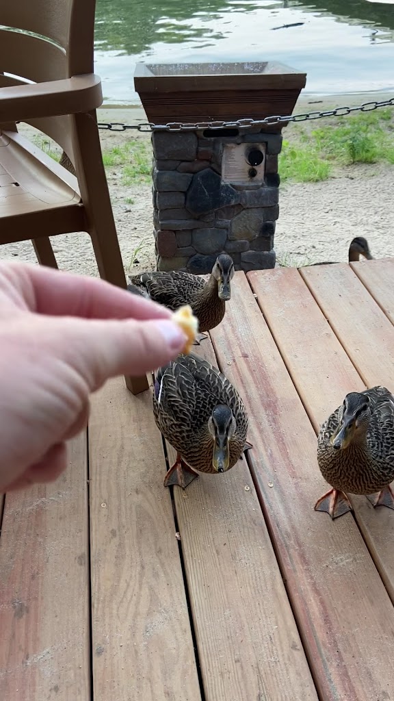 The atmosphere was unbeatable. Table with a lake view. Very quiet and peaceful. Off the beaten path. Very friendly ducks were highly entertaining for my kids.