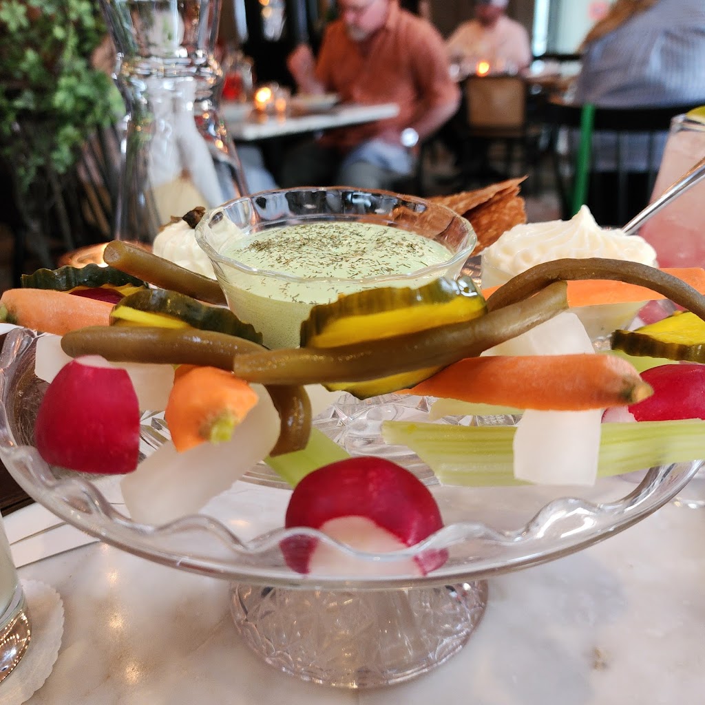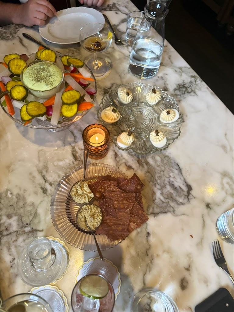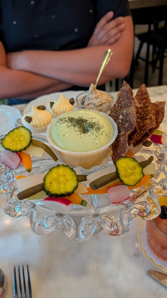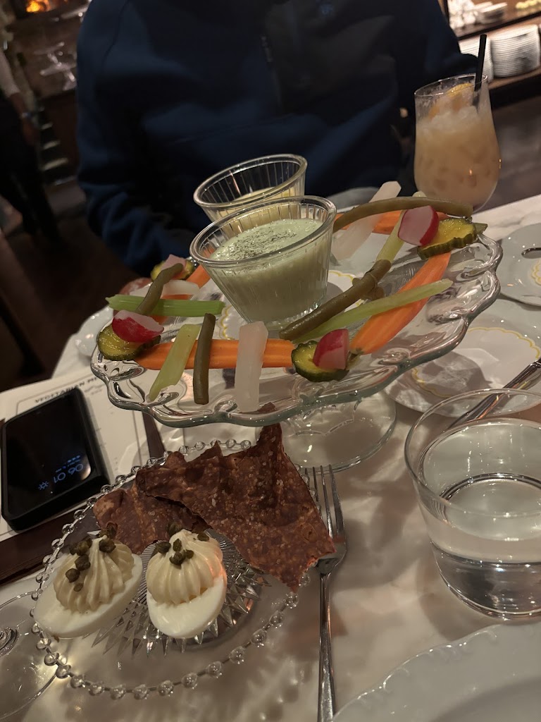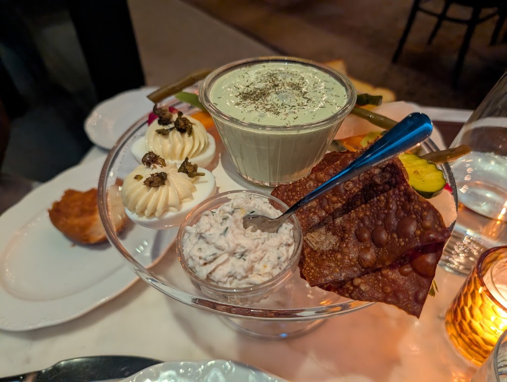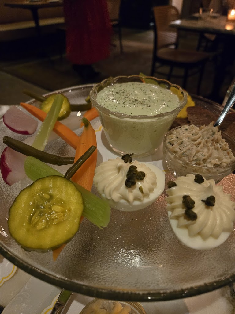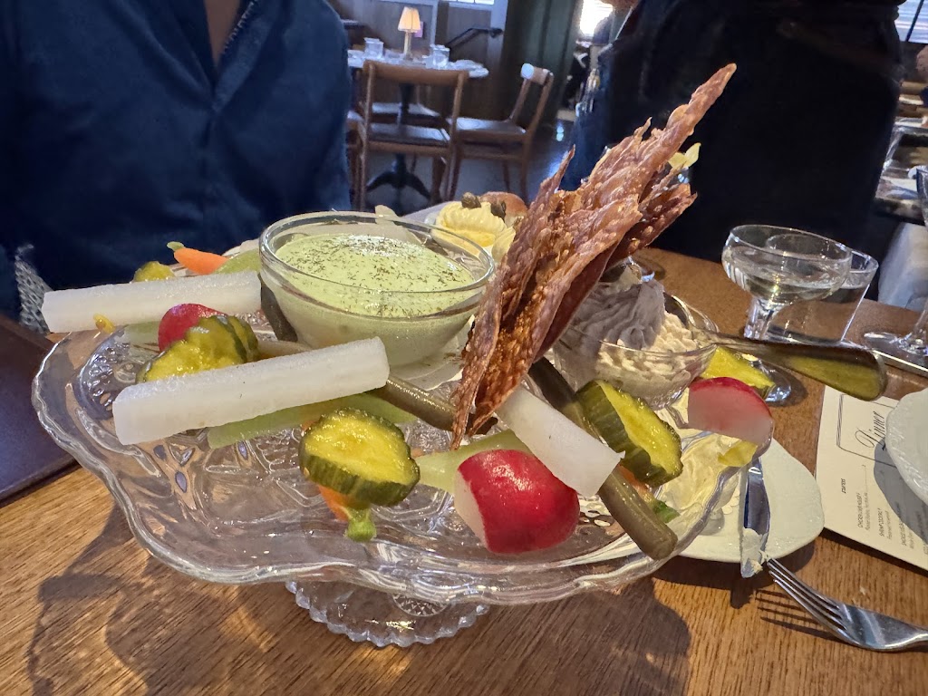 We had heard so many things about Harvey House and were so excited to give it a try… it’s definitely one of the most enjoyable restaurant environs in Madison. Warm, classic and romantic. And the open kitchen was fun to watch.The food winners for us were the walleye, which was perfectly crafted with its delightfully crunchy crust, and the baked potato,which had a crunchy crust and soft flaky inside. The veggie platter had a small sampling of mostly pickled veggies paired with boatloads of lemon and green goddess dips that didn’t work with the pickles, overly salted deviled eggs and a smoked salmon spread served with a few pretzel crackers. We had a chickpea dish that was comprised of chickpeas and chickpea fritters with arugula in an oily sofrito. It was screaming for a few other ingredients to balance out all of the chickpeas and a bit overpriced at $29. In terms of service, there was more staff working than I have ever seen at a restaurant in Madison, and they definitely provide excellent service, but it can be a bit much when they come to pick up each dish even before you put your fork down. The apple merengue dessert was a delicious surprise. All in all, we enjoyed it, and hope the plant based options can match the quality of the other menu items next time around.