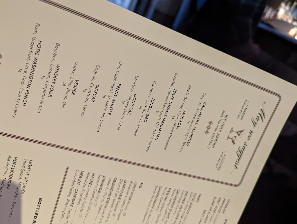 Lively atmosphere, impeccable service, beautiful building, and a creative, elevated take on Wisconsin supper club dishes. Great place for date night, business dinner, or special occasion. Service couldn't have been friendlier from the moment we walked in. Walleye with spatzle and horseradish was the star for me. I admit to being somewhat skeptical of the $18 relish tray, (which is often included in the price of dinner at a traditional supper club), but it was huge and the presentation was stunning. Would definitely return. Free parking onsite. Reservations recommended.