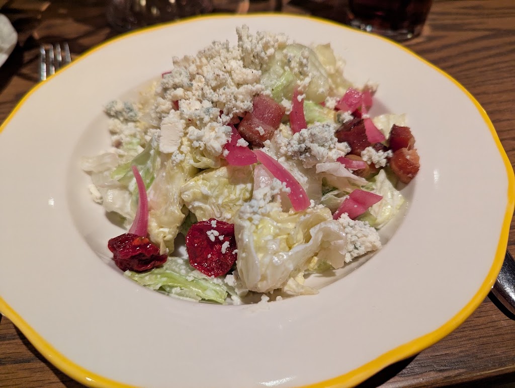 Came here for a work event they had a pre plan menu to choose from. And everything was just great. My water glass was never empty. We dined in the office part of the restaurant. The chopped salad was great. You didn’t even taste the blue cheese.