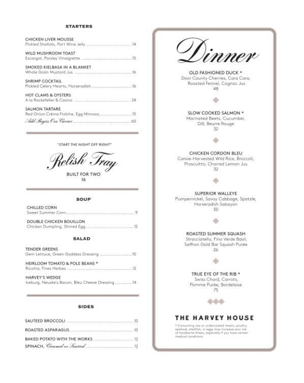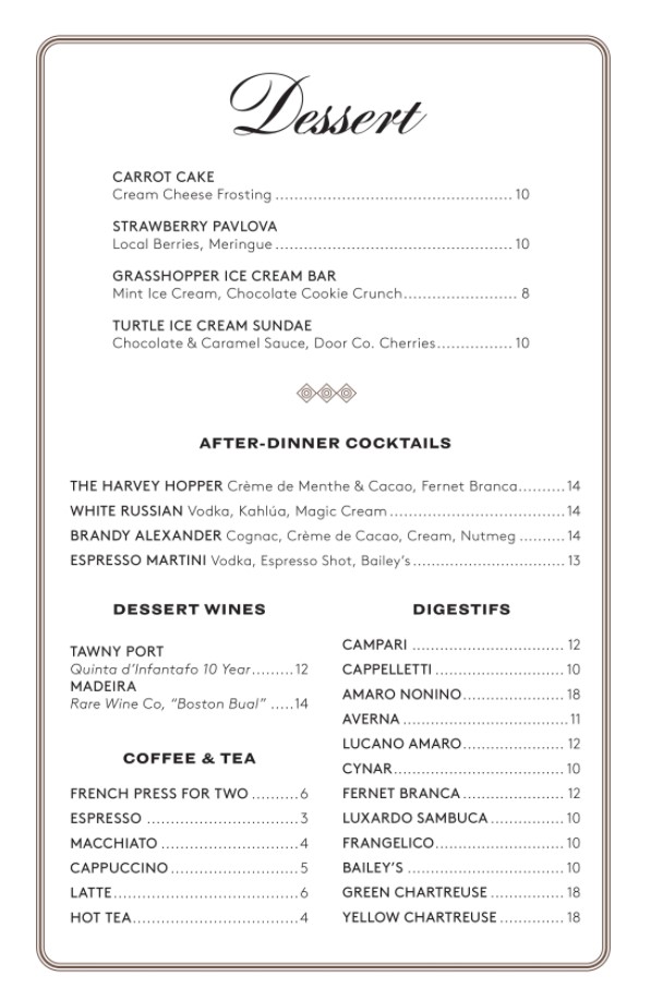 We had a wonderful experience at Harvey house. Patrick was amazing. Attention to detail and very friendly. Theresa was also especially helpful. We love dining at The Harvey house! My favorites of the evening were the Aviator cocktail, the French onion soup, and the chocolate cake!!