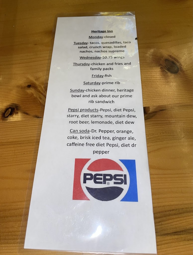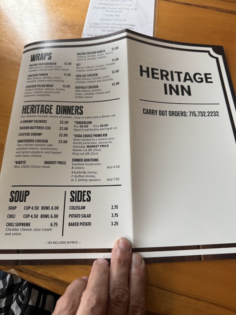 First time visiting the Heritage Inn and happy we did. My wife and I had the ribeyes, nice big steak, friends of ours had the prime rib, very large cuts and taking some home with them. Very friendly staff, Becky our waitress was outstanding, remembered everyone’s name, quick with what we needed!! Great variety in the menu, from appetizers, burgers, pizza and dinner items, we will be back!!
