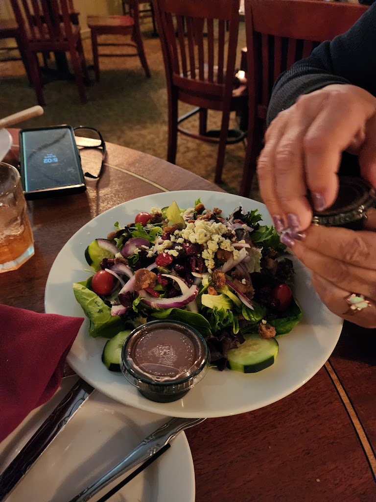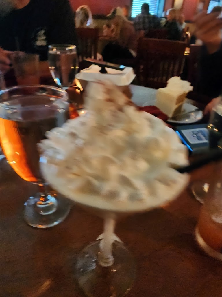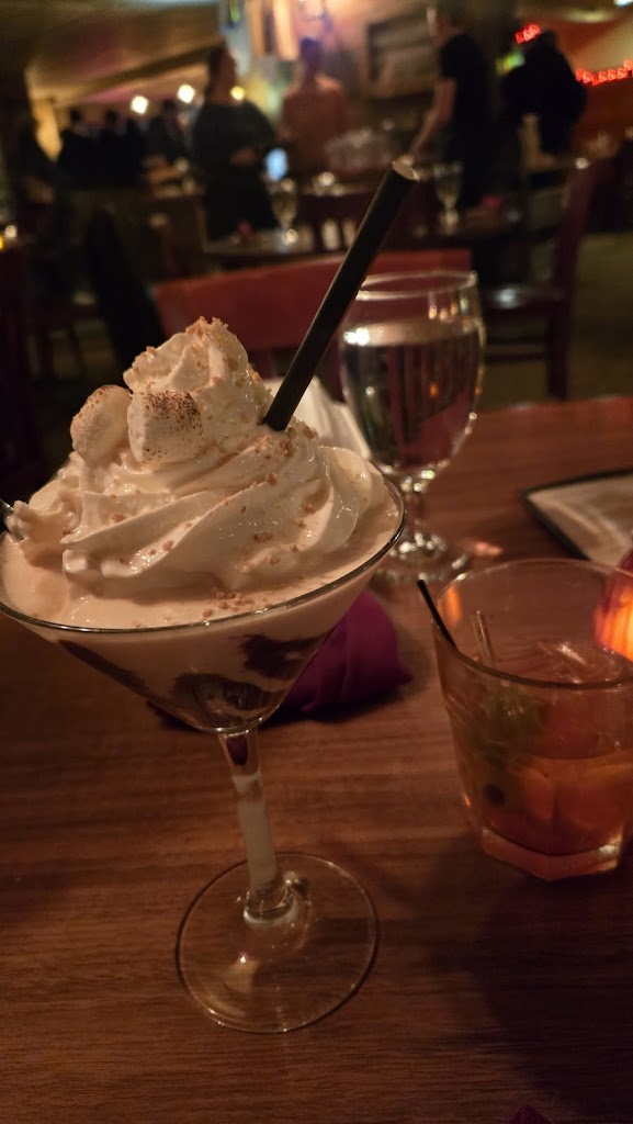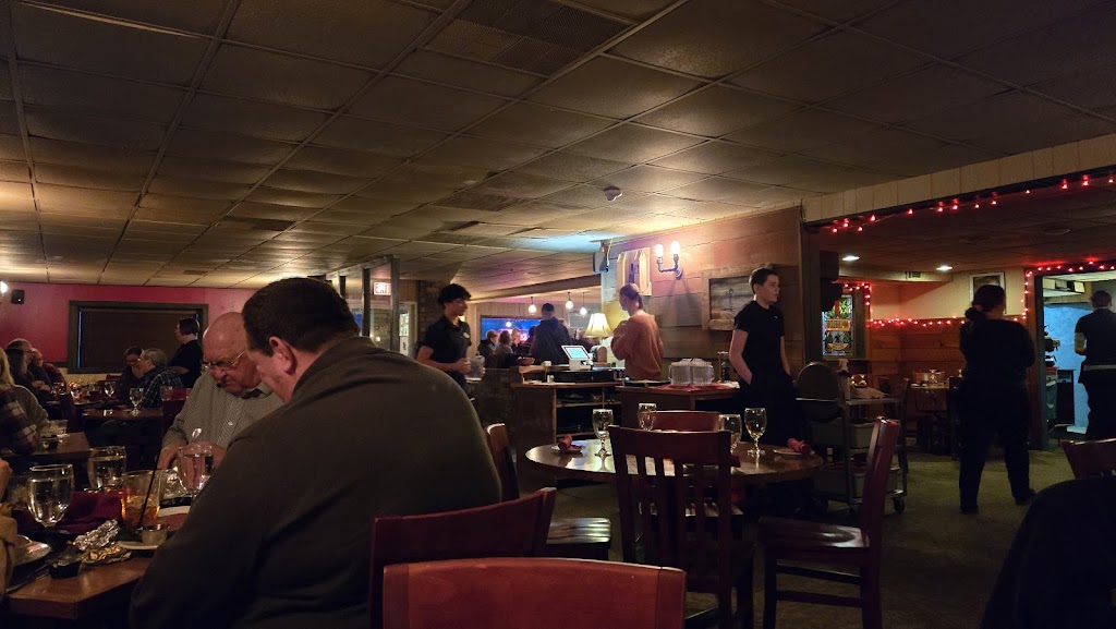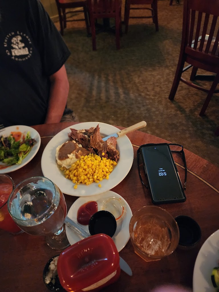 Our seating was opposite of the bar near the entryway and the partition wall greatly isolated the bar racket. We ordered the NY strip and the slow roasted prime rib. Fries, scalloped potatoes, and chili were sides. The fries had been sitting long enough to be only warm, but I could tell when they were fresh they would have had a good subtle crisp. The scalloped potatoes and chili were great. The NY was seasoned well and was perfectly cooked to medium. The 24-hour slow roasted prime rib (Saturdays) was very tender, though the flavor could have been better. The aus jus saved it and was good. We decided to also order the desserts of a grasshopper (one of the best I've had) and cheesecake. This was house made pumpkin cheesecake and was of a generous portion. My wife and I would eat here again. We might have to come back sooner than expected for more chili! Keep an eye out for drunk townies. Some dude in his 60's with a group thought it was a good idea to quickly fake lunging out in front of my car as I was pulling in. It was 5pm. Bro, you gotta live long enough to get SSI and your AARP card. Be less stupid.