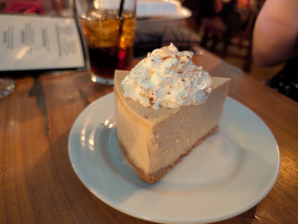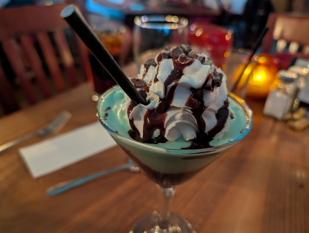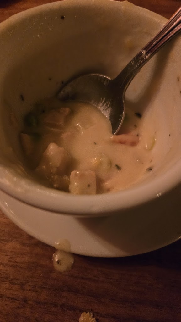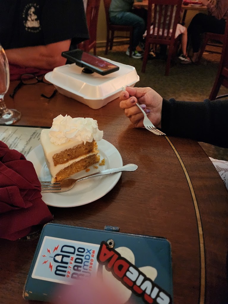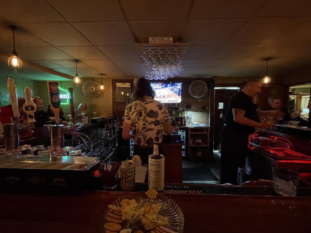 Our seating was opposite of the bar near the entryway and the partition wall greatly isolated the bar racket. We ordered the NY strip and the slow roasted prime rib. Fries, scalloped potatoes, and chili were sides. The fries had been sitting long enough to be only warm, but I could tell when they were fresh they would have had a good subtle crisp. The scalloped potatoes and chili were great. The NY was seasoned well and was perfectly cooked to medium. The 24-hour slow roasted prime rib (Saturdays) was very tender, though the flavor could have been better. The aus jus saved it and was good. We decided to also order the desserts of a grasshopper (one of the best I've had) and cheesecake. This was house made pumpkin cheesecake and was of a generous portion. My wife and I would eat here again. We might have to come back sooner than expected for more chili! Keep an eye out for drunk townies. Some dude in his 60's with a group thought it was a good idea to quickly fake lunging out in front of my car as I was pulling in. It was 5pm. Bro, you gotta live long enough to get SSI and your AARP card. Be less stupid.