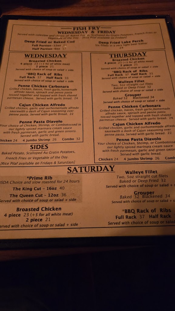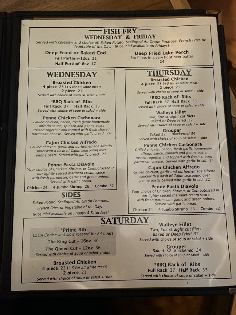 My husband and I ordered the prime rib and it was both cold and incredibly bland. My son ordered the broasted chicken (which was good) with a side of grilled shrimp that was again bland and charred. They have a relatively limited menu on Saturday so we hoped what they offered they did well - unfortunately that was not the case. Pretty disappointing for a first impression and for the price I’d hesitate to go back.