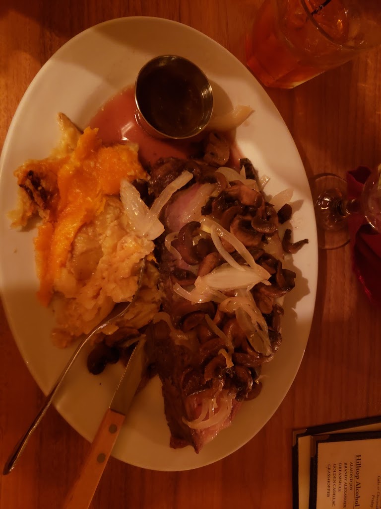 We ordered the king size prime rib and split it between the two of us (reasonable $5 split plate charge). The meat was cooked exactly to our order and was delicious. All the sides ( those that came with meal and the extras we ordered) were also very good. The bar drinks were well made. The desserts (a grasshopper and a crème brûlée) were scrumptious. The ambiance is a bit dated, but did not take away from the food, excellent attentive staff, or experience. We had reservations, but could have been quickly seated without them, but we came shortly after they opened and the parking lot was filling up by time we left. Highly recommend.