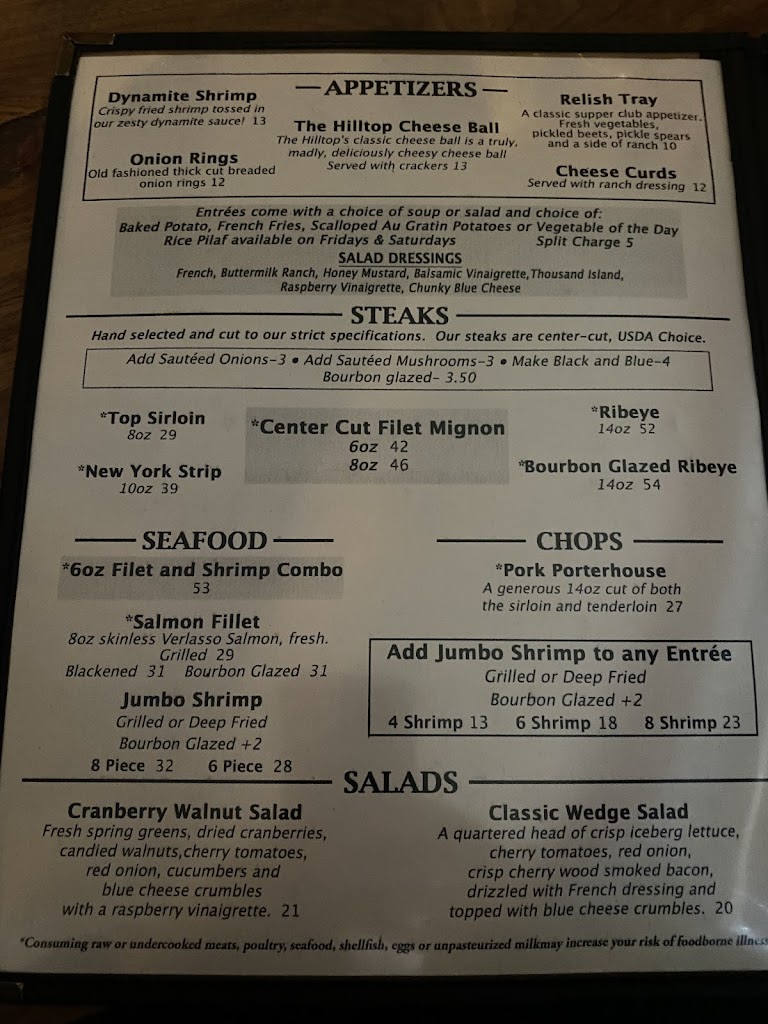 I have gone to The Hilltop for yrs and I believe here closing out 2024 it's the best it's been. People talk about Green Acres or other supper clubs in the area but The Hilltop is 50% better than the others.