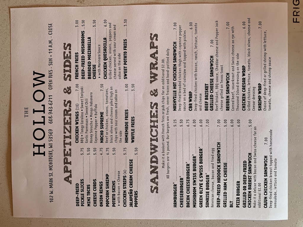 We love the burger at the Hollow. This isn't a frozen fluff patties. It a real burger, thick cut bacon and real cheese. Don't forget the homemade fries or pub chips