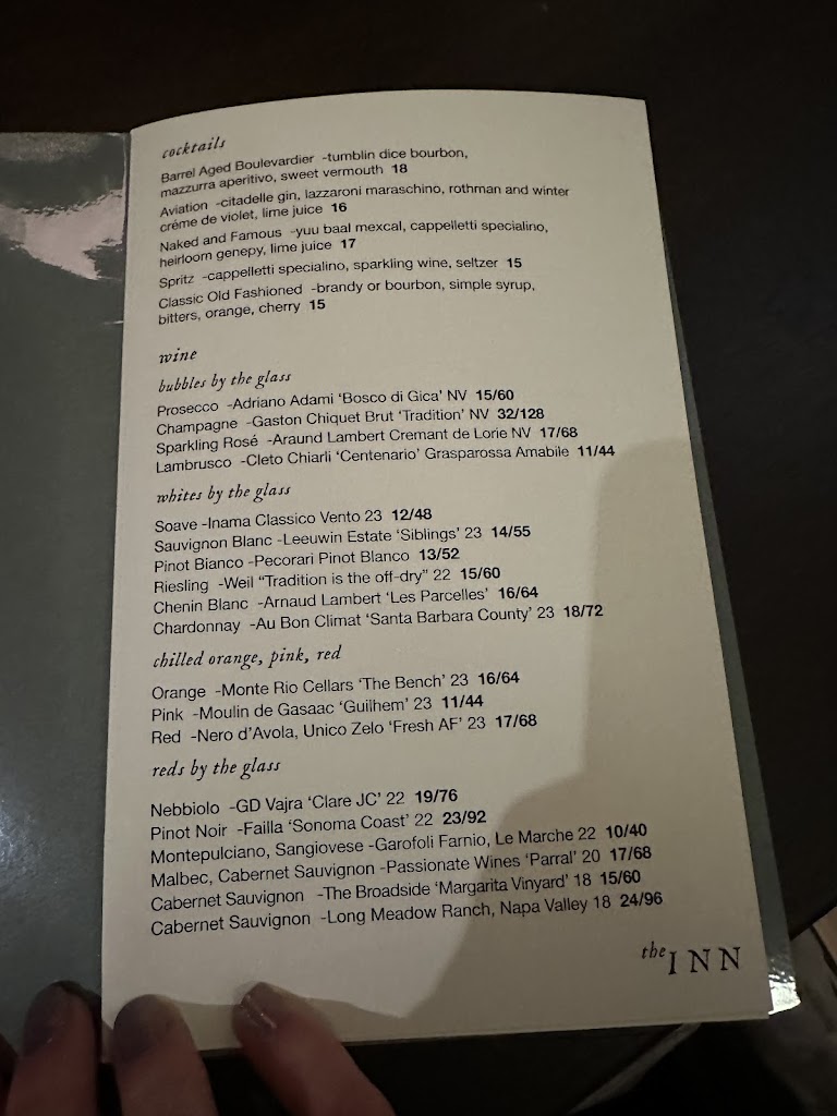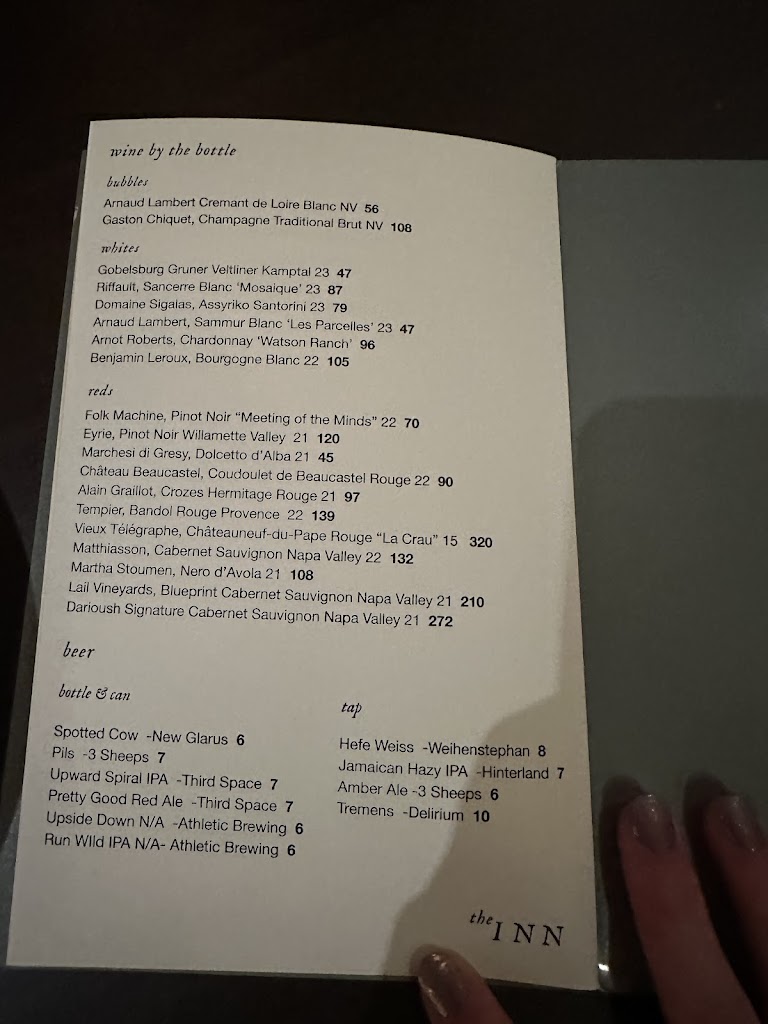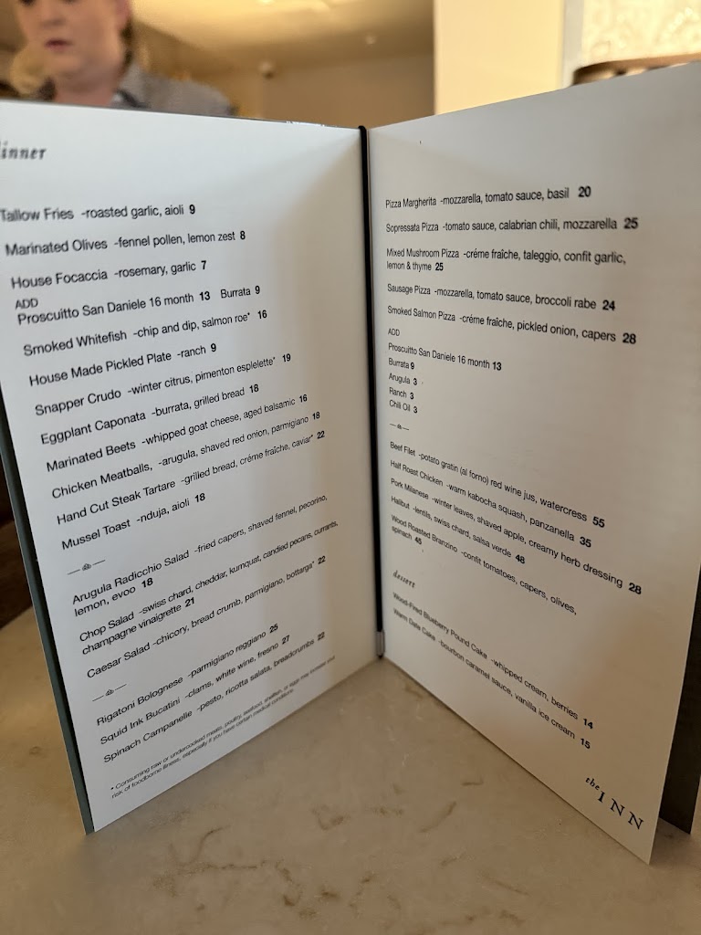 We recently dined at The Inn with friends at the front bar area, and were impressed with every aspect. The renovated space features thoughtful design elements with touches of the past like the exposed brick walls. Plush, comfortable seating options were abundant. We shared a few items and really enjoyed the tallow fries, duck, and wood-fired pizza. Cocktails and wine were all fantastic and well presented. The energy was lively, but not too loud to have an easy conversation. Lots of friends and neighbors running into each other. We are excited to return!