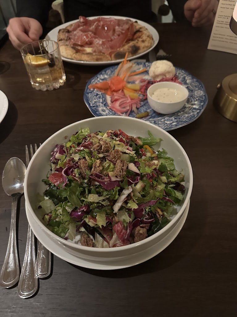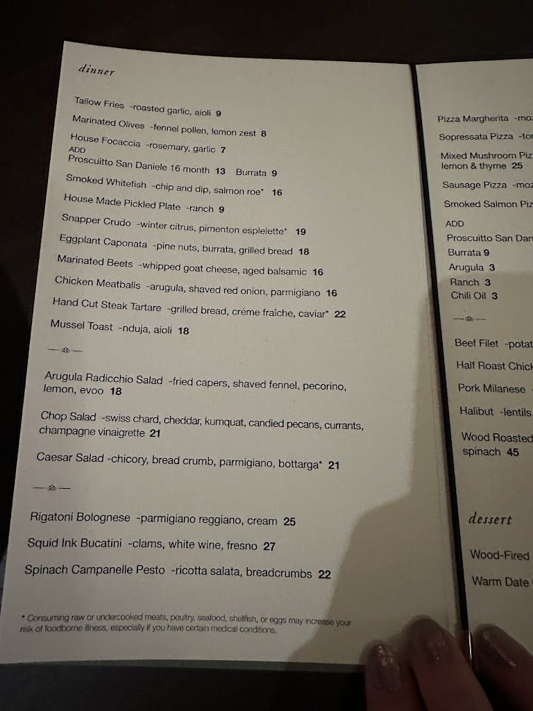 Apps: 4.3/5 the apps are very good. The foccocia order is comically small for the price, beef tartare was good, not the best I've ever had, chicken meatballs were good the sauce was nice and zesty and the white fish dip was pretty good as well. I would stay clear of the salads, they were fine but $22 for a basic ceasar with no protein come on. Pizza was good as well.