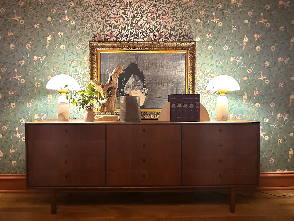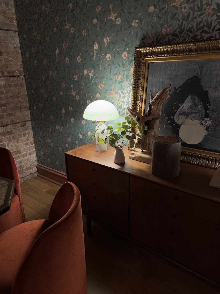 The atmosphere is perfectly charming - a mix of mid century + ultra modern, classic + cozy. Tons of detailed touches like unique lighting fixtures, ornate fabrics, and interesting decor.