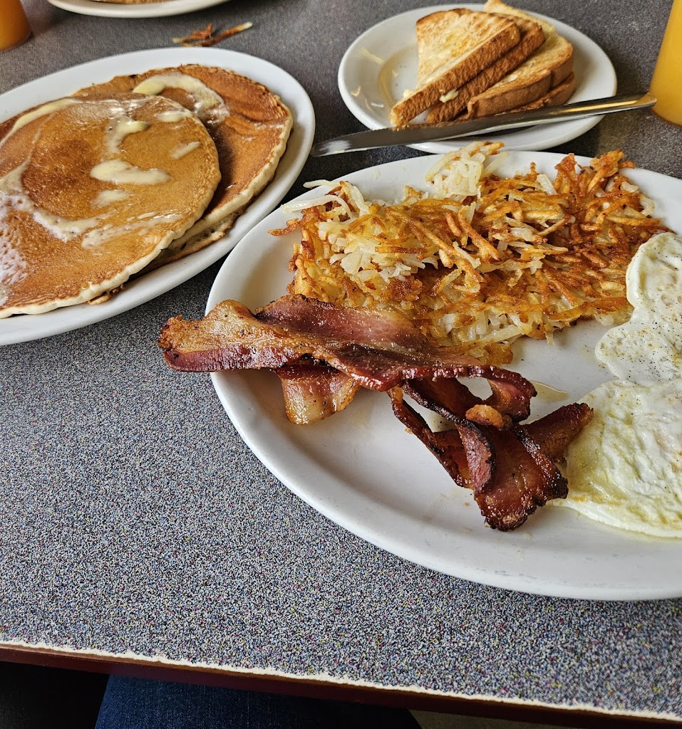 Stopped in on a Saturday for breakfast. Local atmosphere, our server was prompt and very friendly. Food was served quickly and with a smile. Hashbrowns were awesome and pancakes big and fluffy with nice thick bacon slices. Defiantly will be coming back to try the dinner menu.