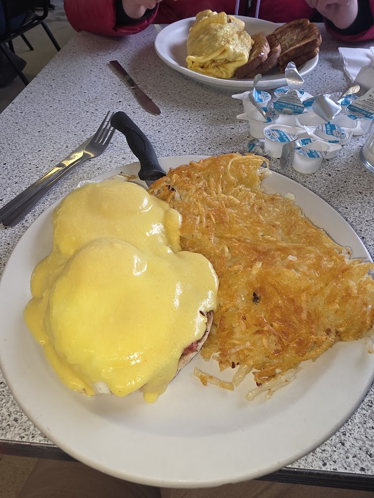 This place serves great food fast. Eggs Benny with hash browns were delicious. Also ordered a side of bacon and one pancake. The pancake was enormous, perfectly brown with crispy edges had a hint of sweetness and the bacon was thick and crispy with a good chew. We will be back!
