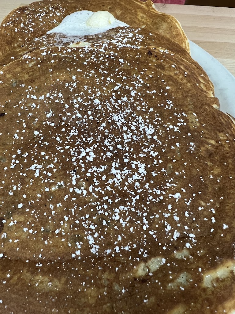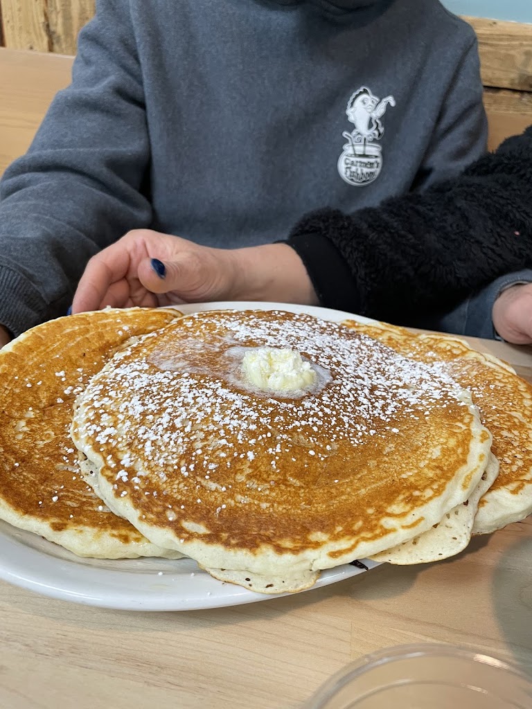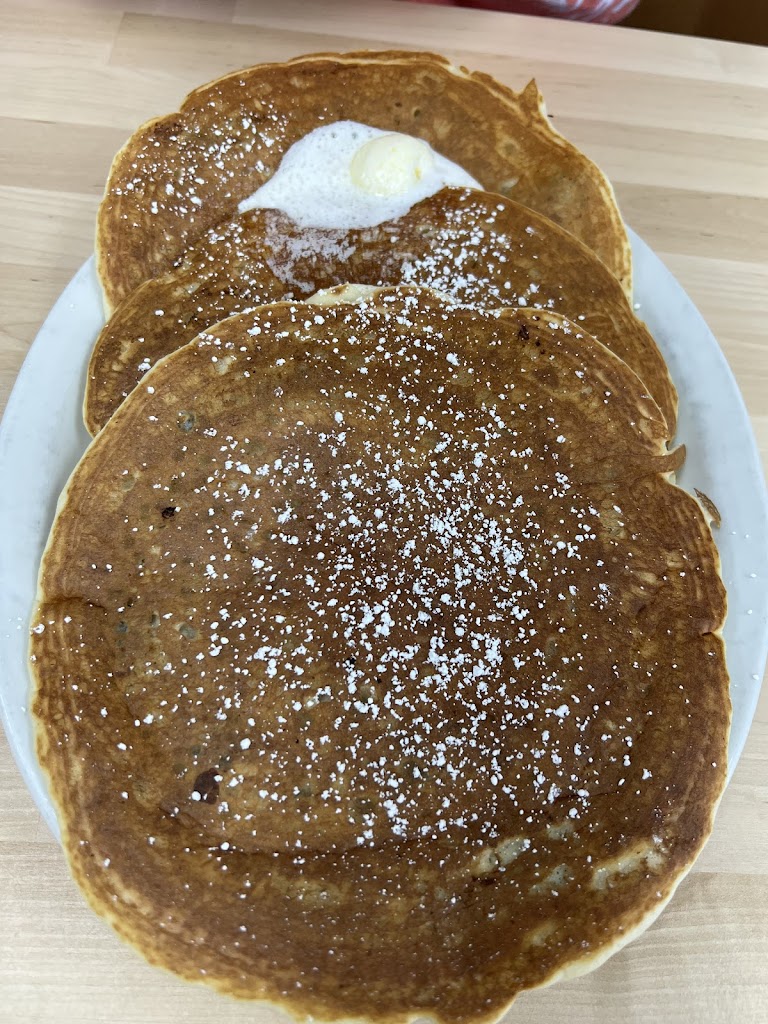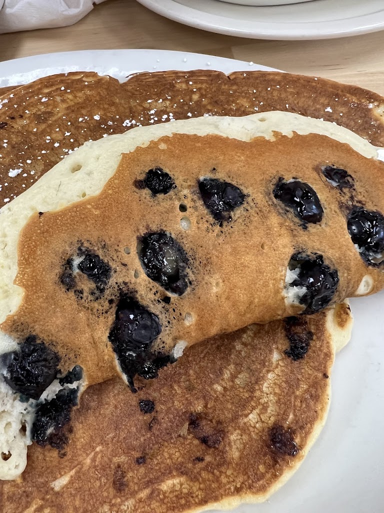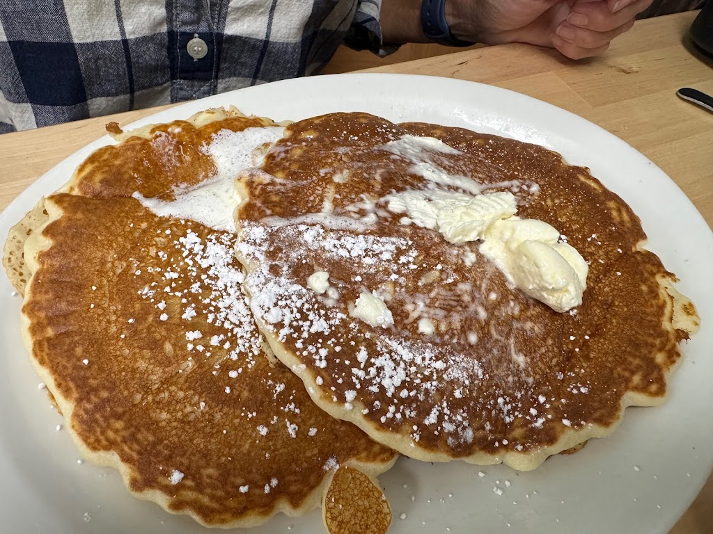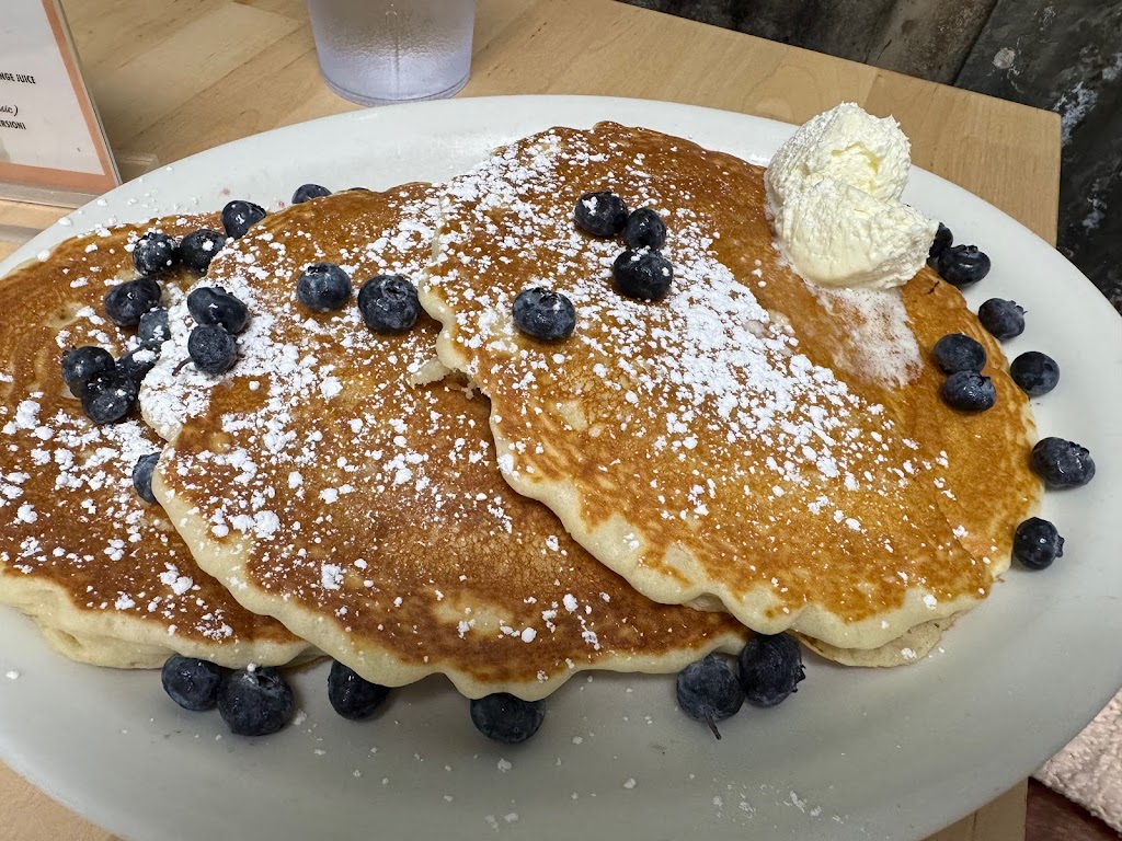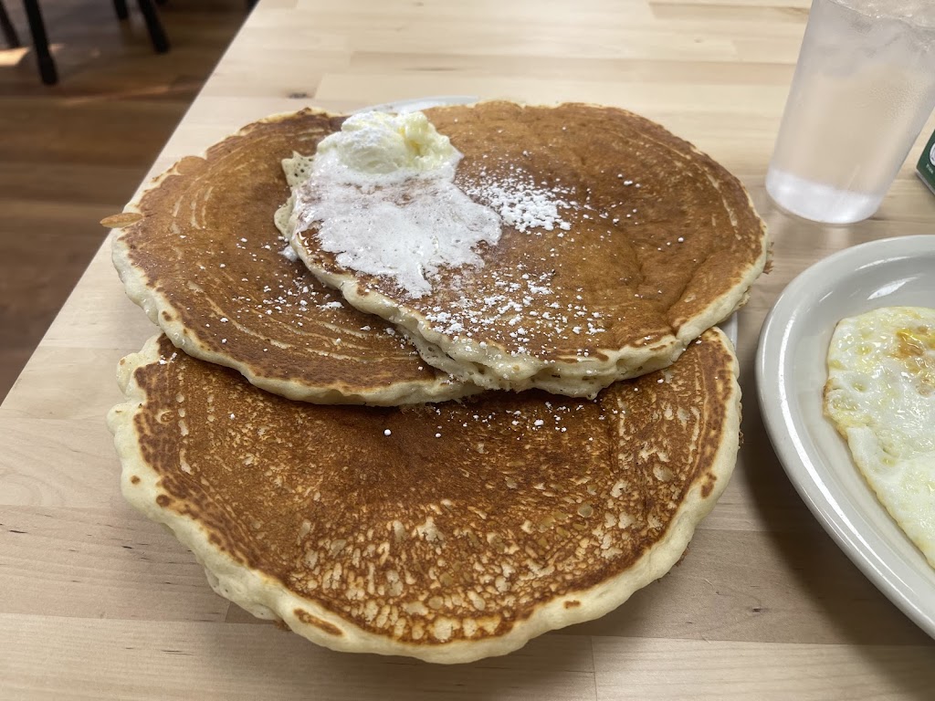 My over easy eggs were a little over done, but the pancakes were good sized (ask for blueberries!).