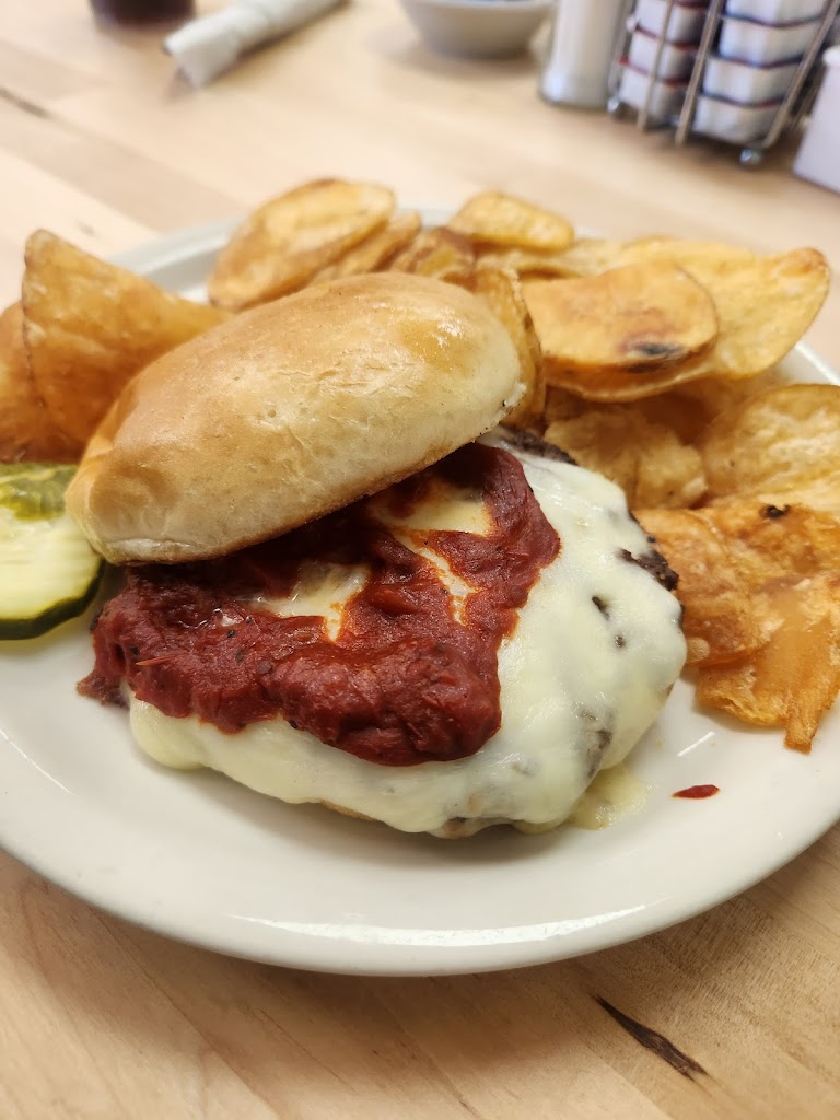 It took a bit, but they were busy and with restaurant staff shortages, we were fine with waiting. Someone came and took our order. I got the Kitchen Klucker sandwich w/o onions. Hubby got the Pizza Burger. We both opted for house chips.